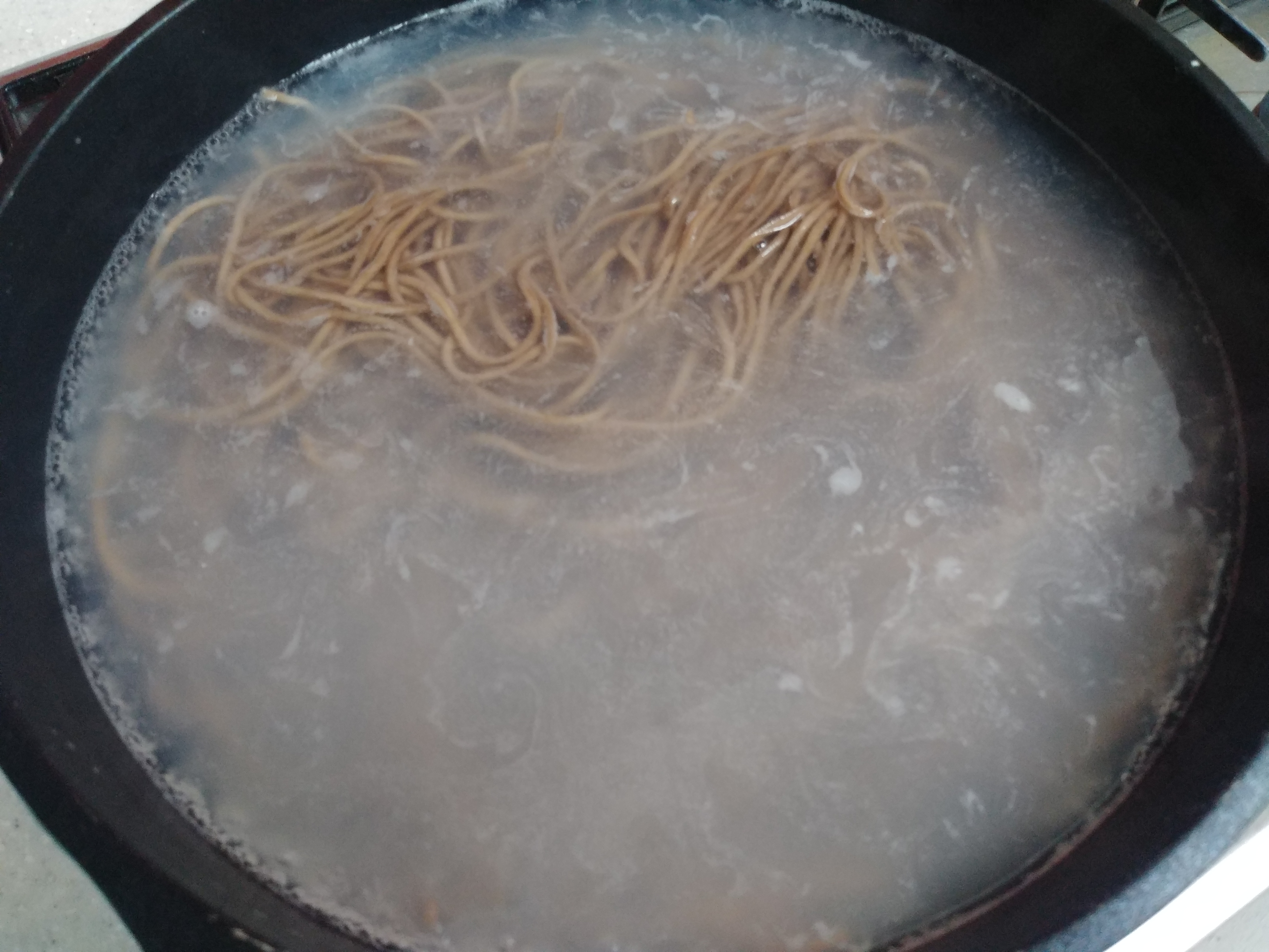 국수 한 타래가 180g이네요. 많은 듯해서 약간 덜어냈습니다. 끓는 물에 넣고 4~5분 삶습니다. 중간에 끓어 넘치면 찬물을 넣어주고 또 끓어 오르면 찬물을 넣어줍니다.