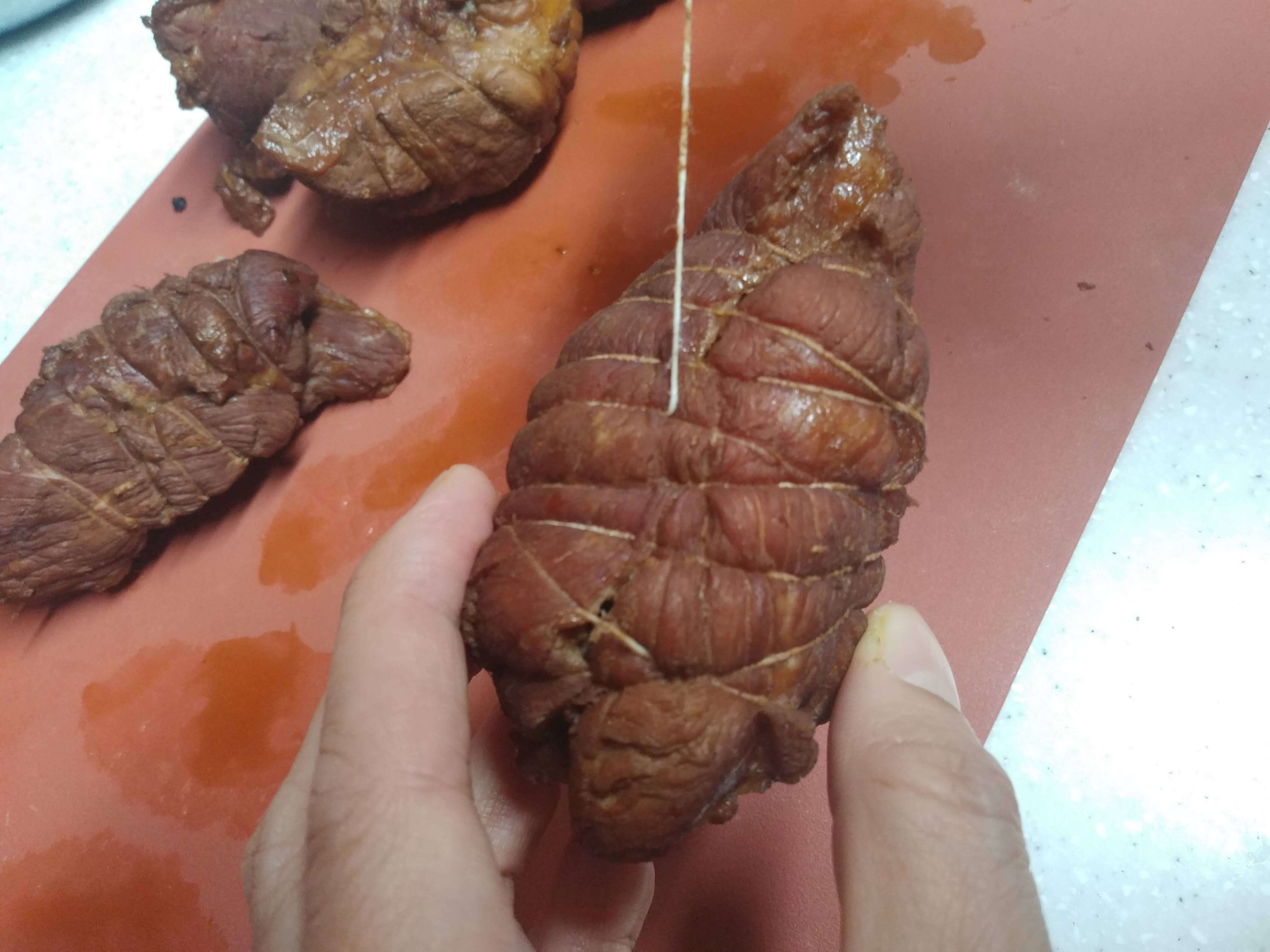5. 고기가 식은후에 실을 제거해줍니다. 실을 들어 고기와 직각이 되도록 유지하면서 풀러 주어야 고기가 으스러지지 않고 잘 제거됩니다. 오향장육은 차게 먹는 음식이라 랩으로 싼 후에 냉장고에 넣어둡니다. 손님 초대상에 낼 음식이라면 그 전날 삶아서 냉장 보관했다가 당일에 썰어 먹으면 좋습니다.