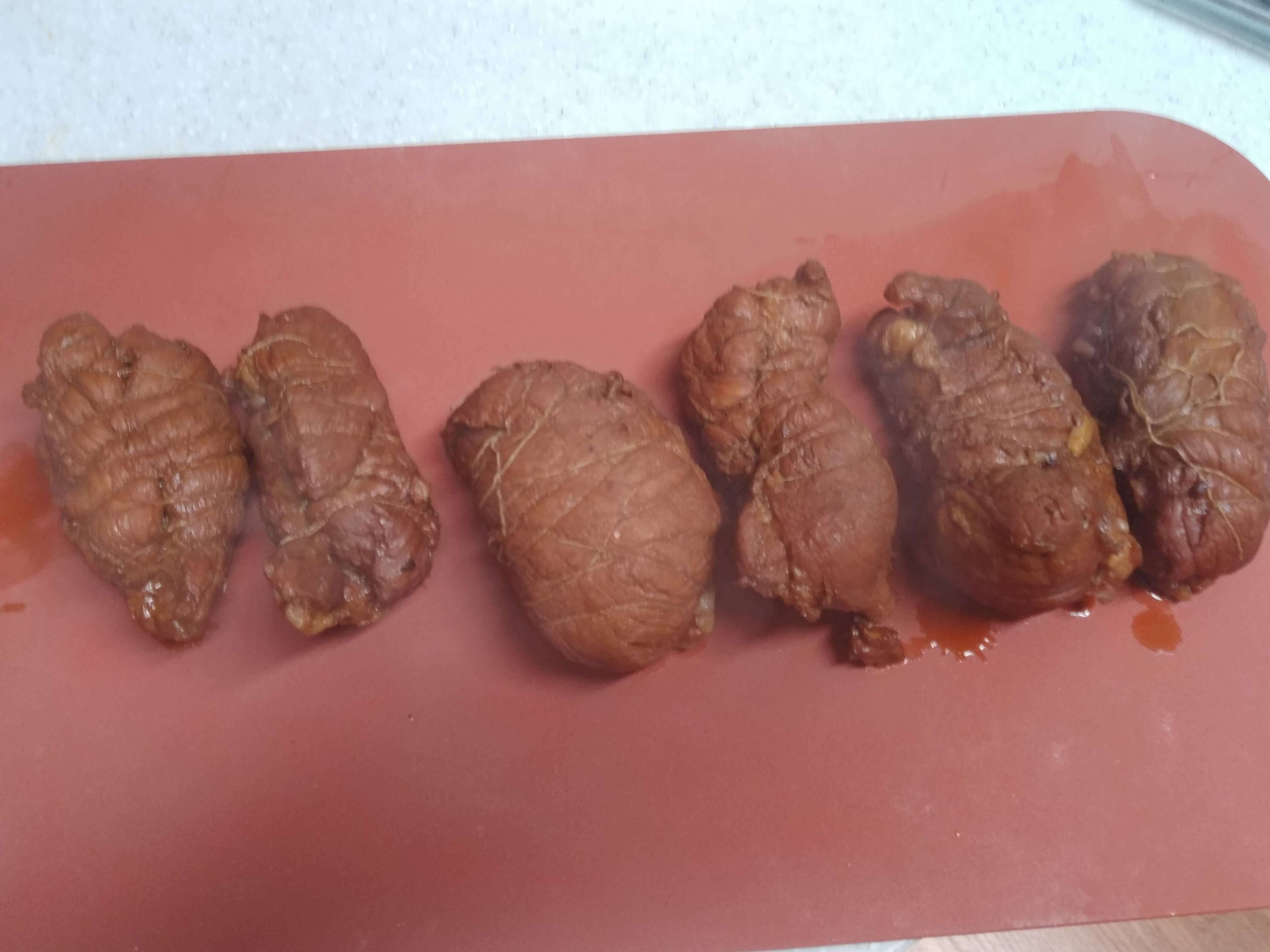2. 찬물에 담가 핏물을 빼준후에 굵은 실로 묶어주었습니다. 모양을 잡아주기 위해서 벌어진 고기 살을 모아서 묶어줍니다. 묶은 후에 익히면 살이 잘 모아진 채로 그대로 익기 때문에 칼로 썰었을 때 모양이 예쁘게 나옵니다.