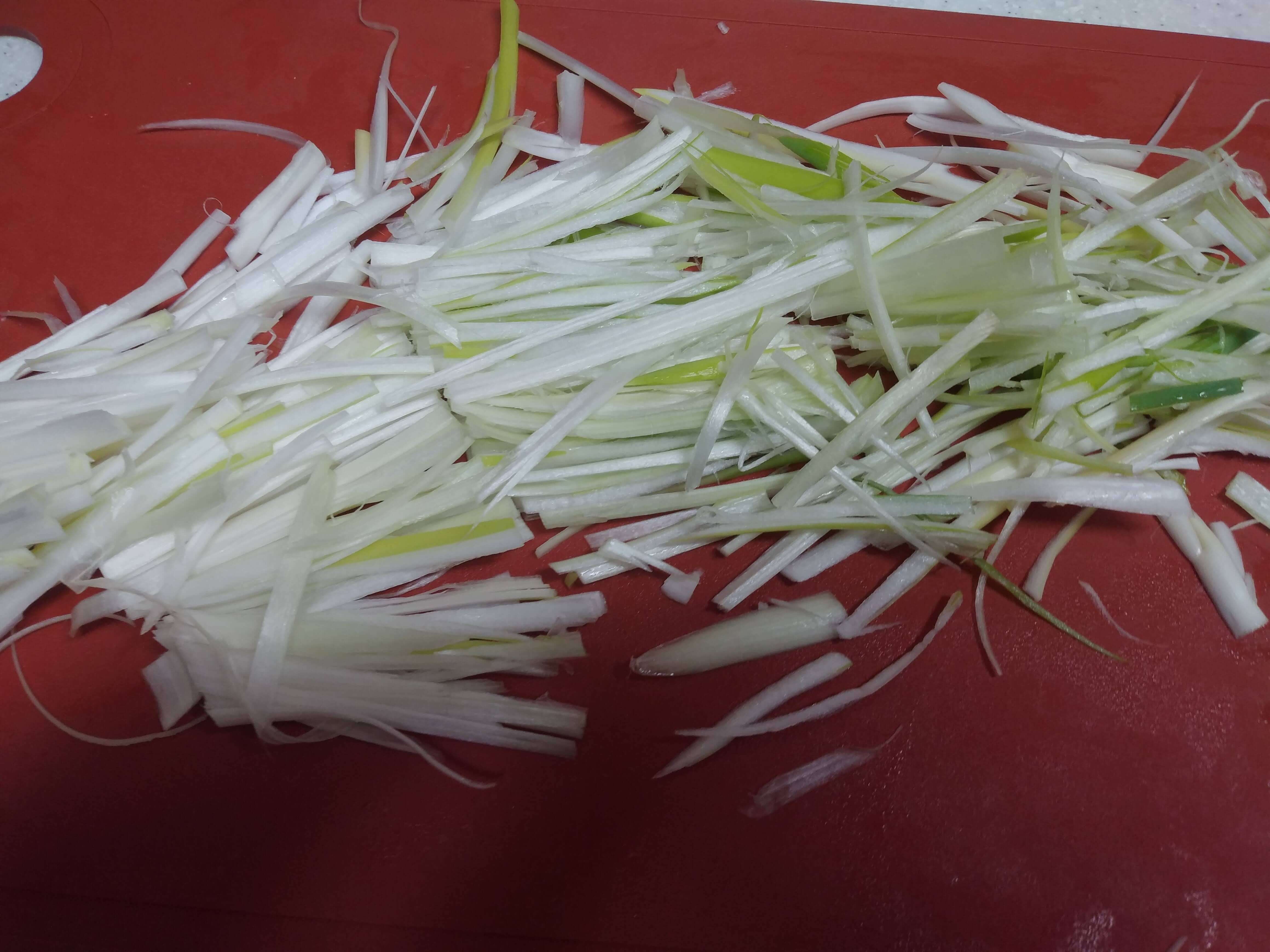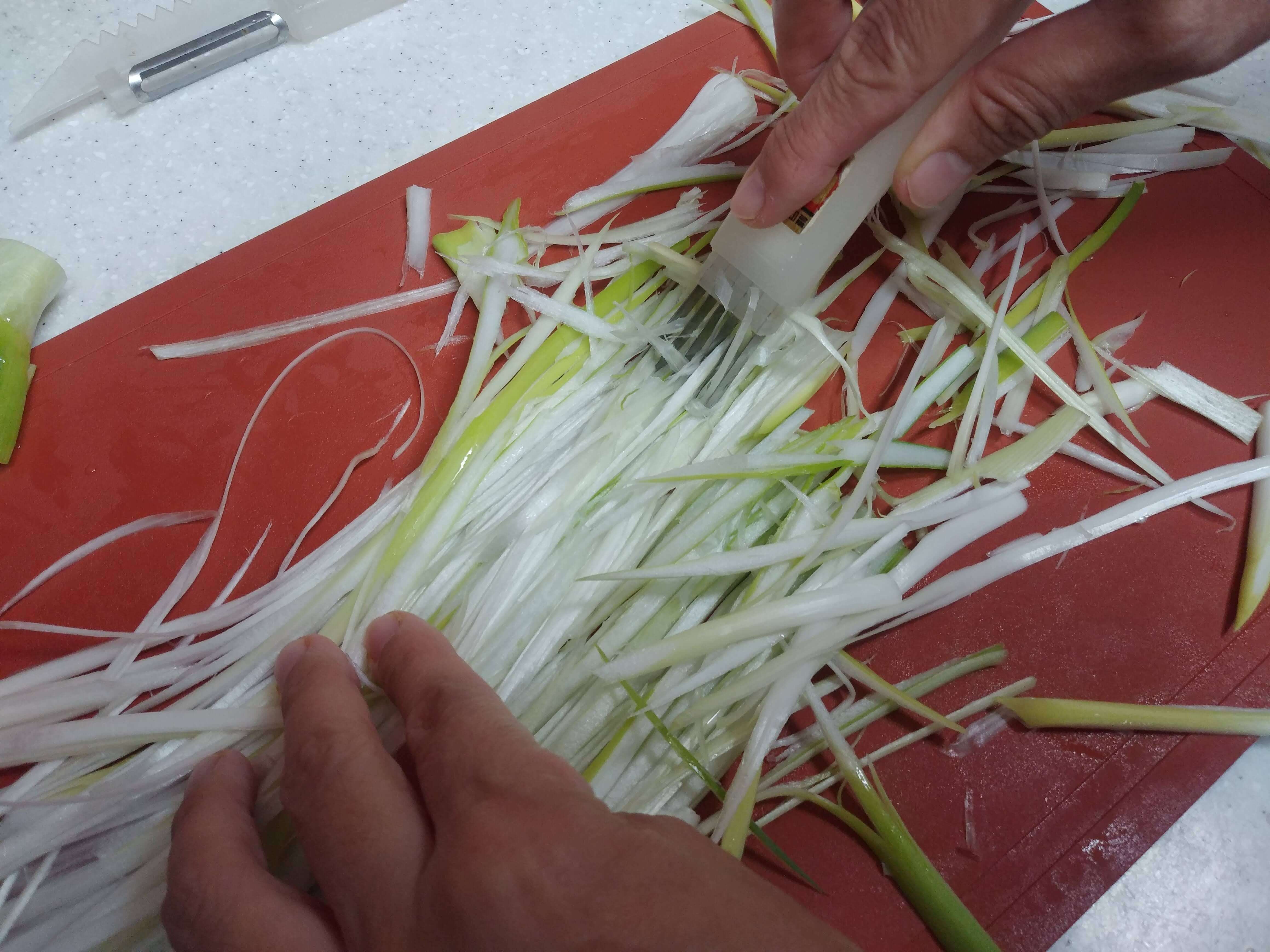 6. 먹기 직전 채소를 준비합니다. 대파는 얇게 채썰어주는데 저는 파 채칼을 이용해서 썰어보았습니다. 파채칼로 긁어낸 후에 적당한 길이로 잘라주었습니다.