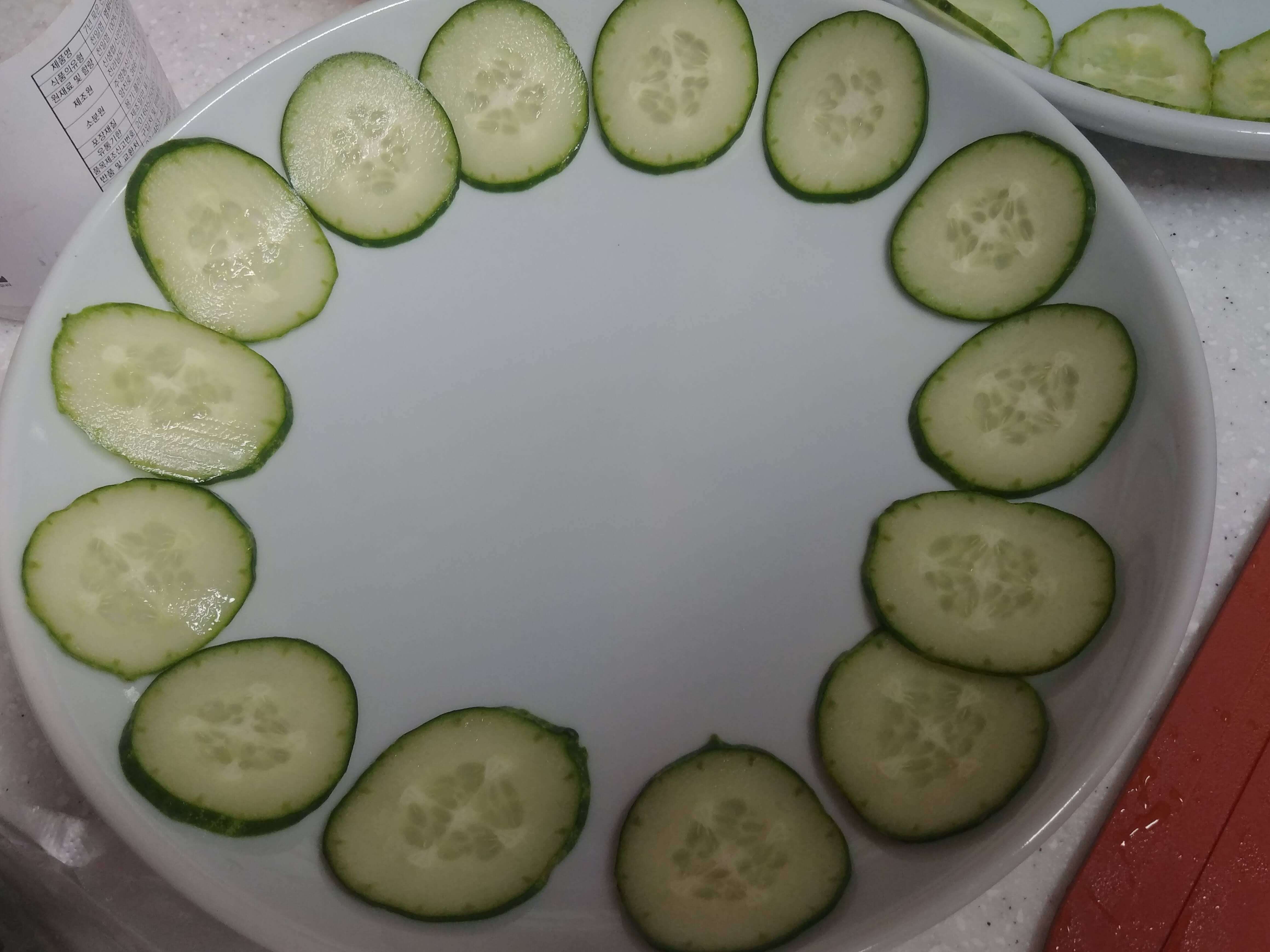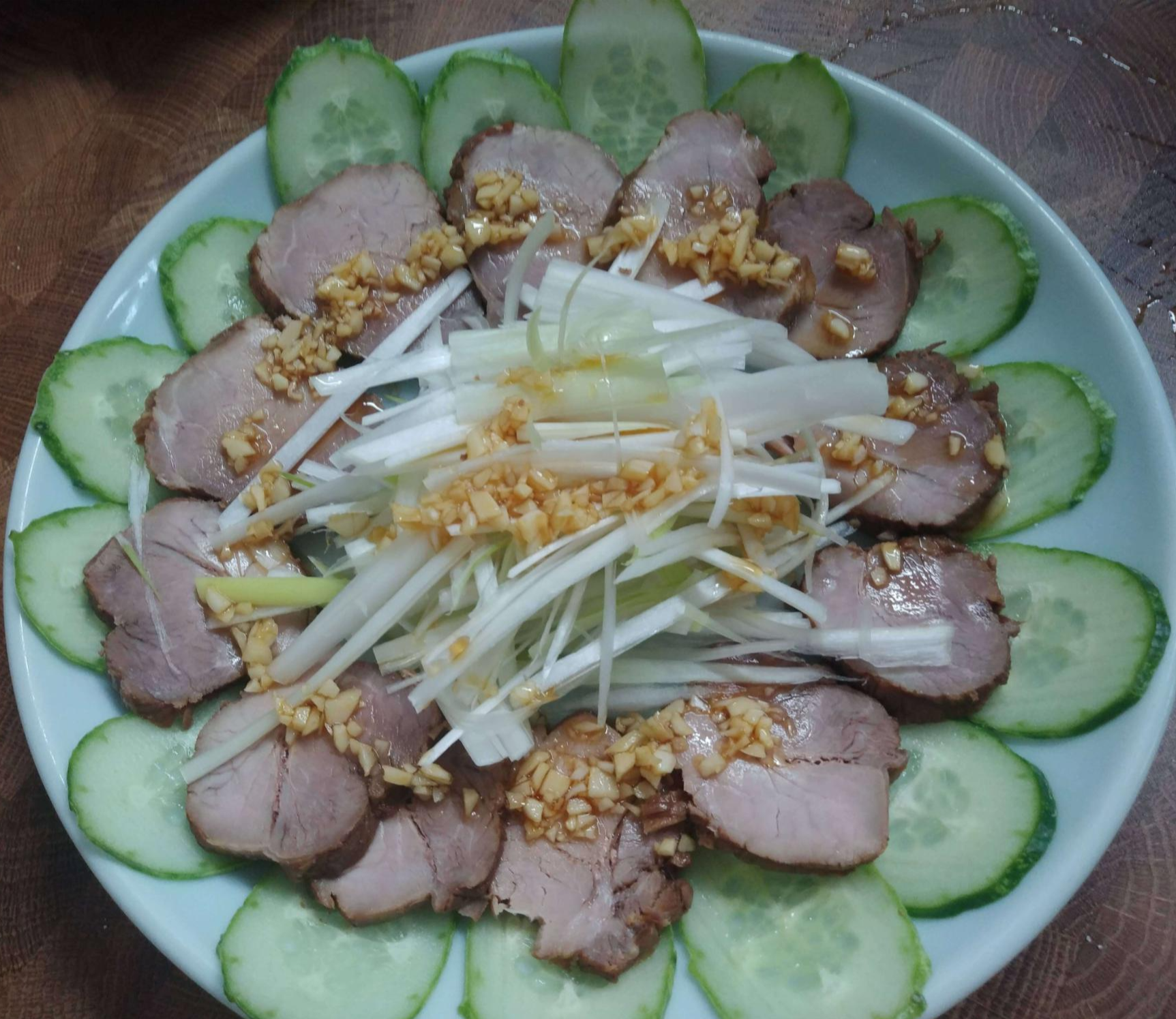 고기를 꺼내서 썰어주고 담습니다. 두께는 적당하게 썰어주고 약간 더 어슷하게 썰어서 오이랑 크기를 맞추어주어도 좋을듯합니다. 오이를 먼저 깔고 고기를 그 위에 올립니다. 가운데에 얇게 채 썬 대파채를 올리고 소스를 골고루 뿌려주면 완성입니다.