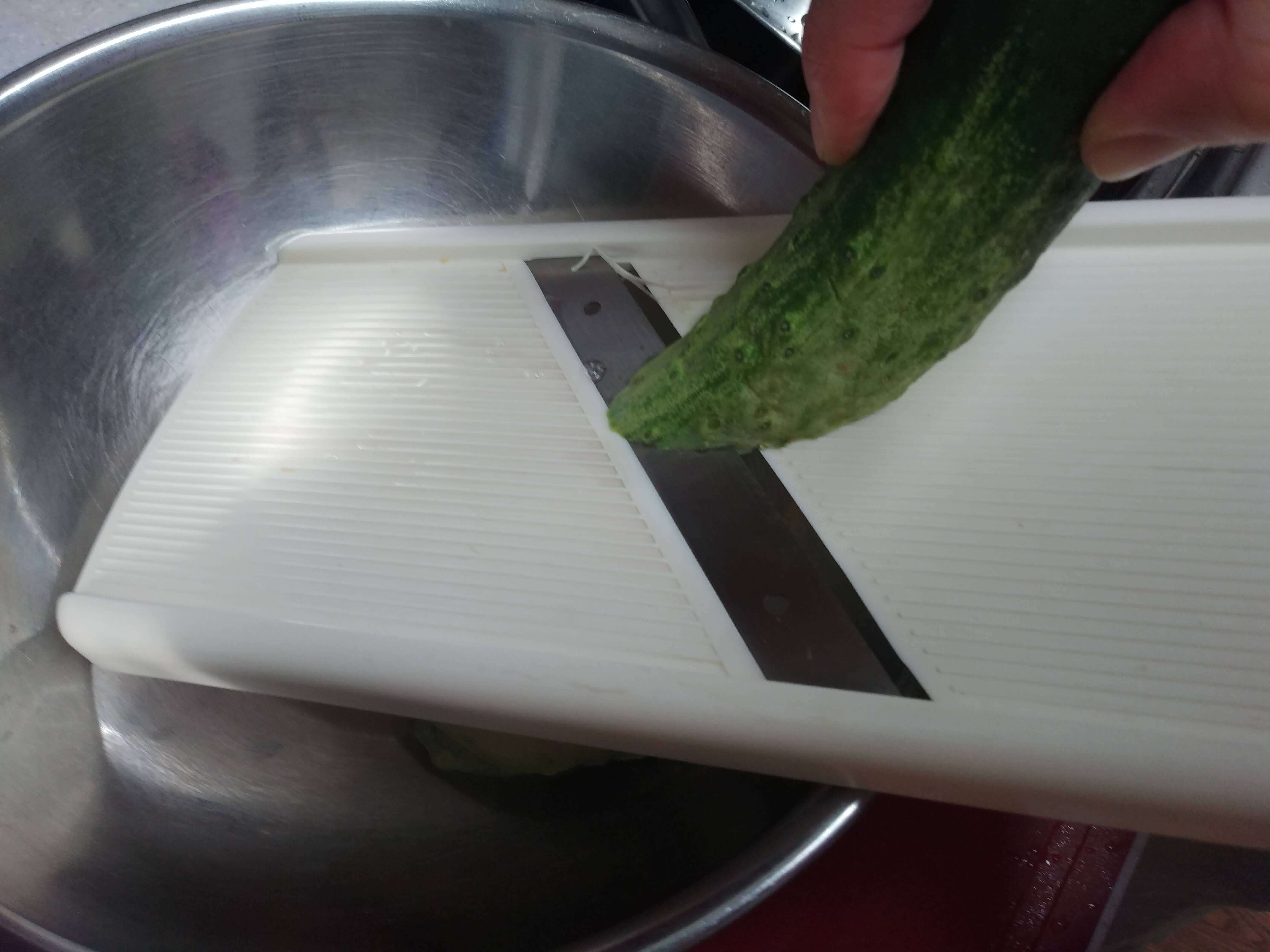 7. 오이도 채칼로 얇게 썰어주었구요 양념장을 만들었습니다. 마늘을 칼로 다져서 넣어주고 간장 : 식초 : 설탕을 1 : 1 : 1로 섞어줍니다. 마늘은 간 마늘을 사용해도 되지만 살짝 씹히는 식감이 있도록 칼로 다져주었습니다. 먹기 직전 칼로 다지니 마늘의 향도 진하고 좋습니다.