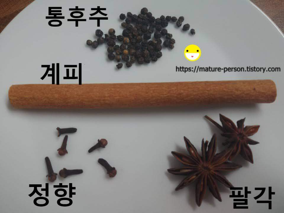 ◈ 계피와 후추의 향은 익히 알고 있는거고 정향과 팔각의 향은 진한 향입니다. 정향과 팔각의 향을 맡고서 후추의 향을 맡으니 아무 향도 나지 않을 정도입니다. 정향보다는 팔각의 향이 좀 더 진한 것도 같고요 뭐라 말로 표현하기 힘든 향이네요. 하옇튼 생긴 모양은 다음 사진과 같습니다. 통후추는 고기 삶을 때 흔하게 넣는 것으로 저는 통후추를 갈아서도 쓰고 있습니다. 계피도 수정과나 계피(시나몬) 향 나는 빵을 만들 때 흔하게 씁니다. 팔각과 정향은 흔하지 않은 향신료인데 팔각은 족발을 만들 때 넣기도 한다고 합니다. 정향은 카레와 오이피클의 재료로 쓰이고 의외로 은단에도 들어간다고 하네요.