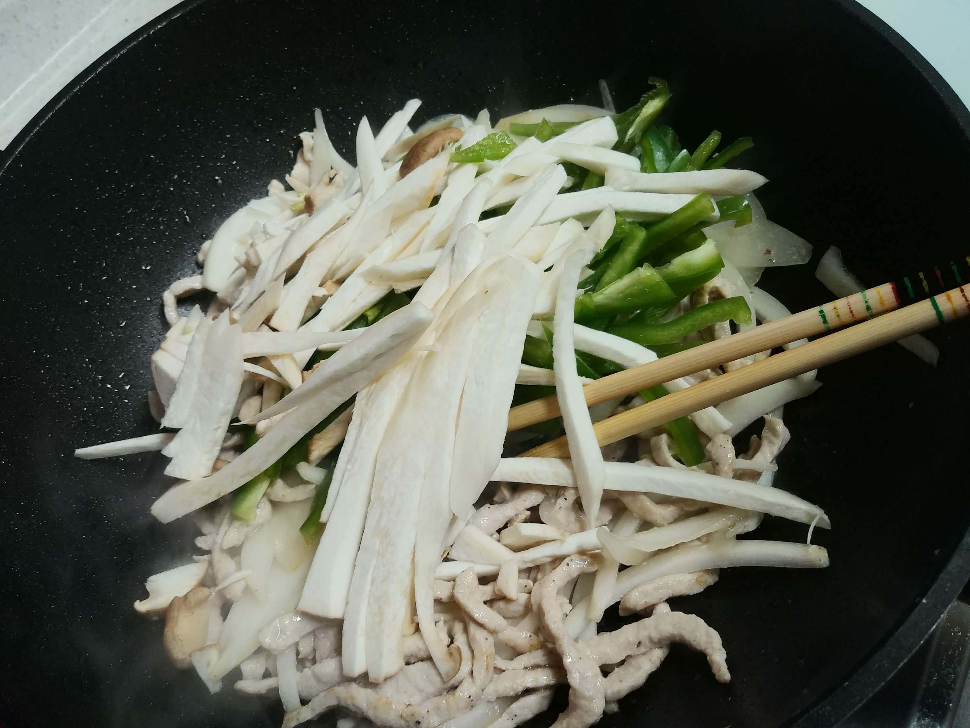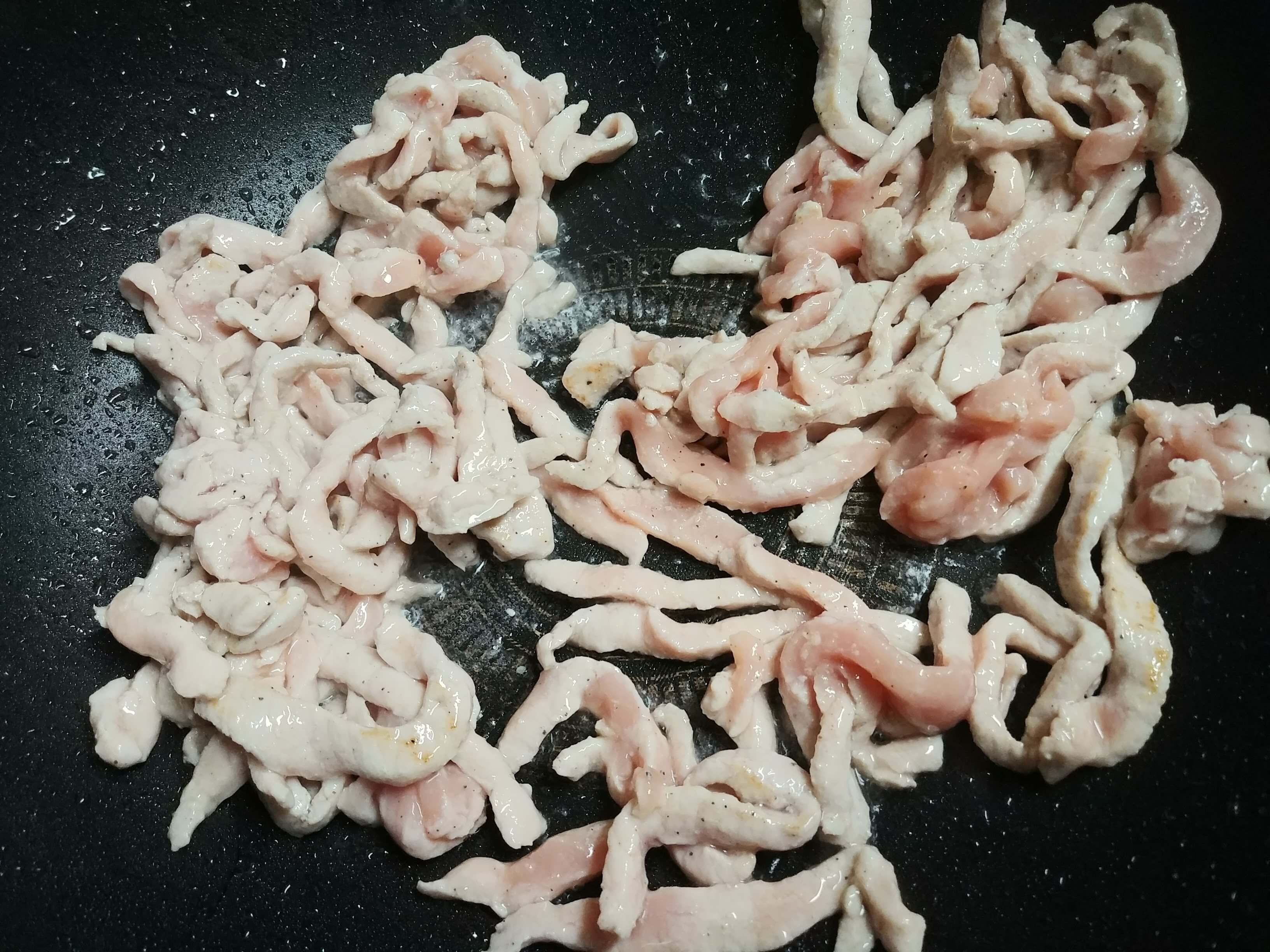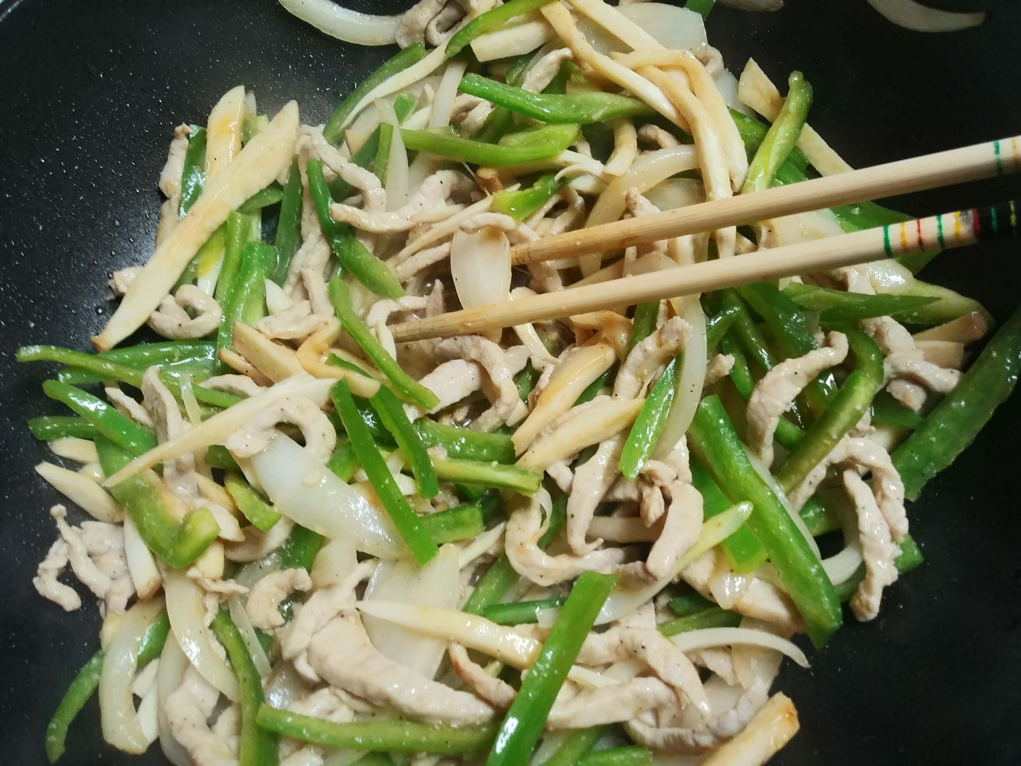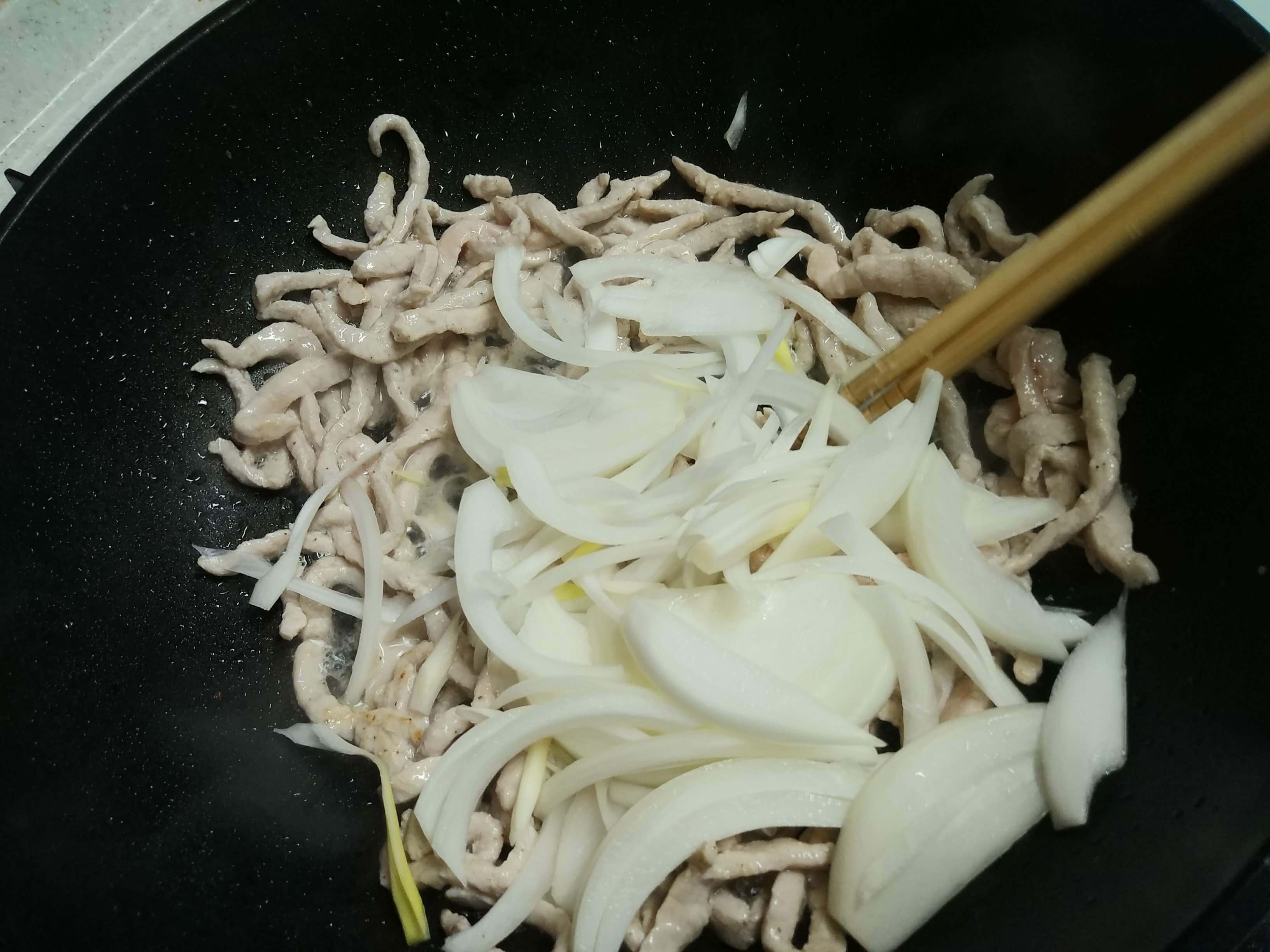 원래 고추기름으로 볶기도 하지만 오늘은 하얗게 볶았습니다. 식용유를 살짝 두르고 고기를 볶습니다. 마늘이나 생강을 채 썰어서 볶다가 고기를 넣고 볶아도 향이 좋습니다. 오늘은 간단하게 만듭니다. 고기가 어느 정도 익으면 양파를 넣습니다. 계속 볶아줄 거라서 고기가 완전히 익지 않아도 양파를 넣어서 같이 볶다 보면 익습니다. 불은 줄이지 않고 센 불로 볶아야 수분이 나오지 않습니다. 중식 볶음이 모두 그렇듯이 센 불에 빠른 시간에 볶아내야 합니다.