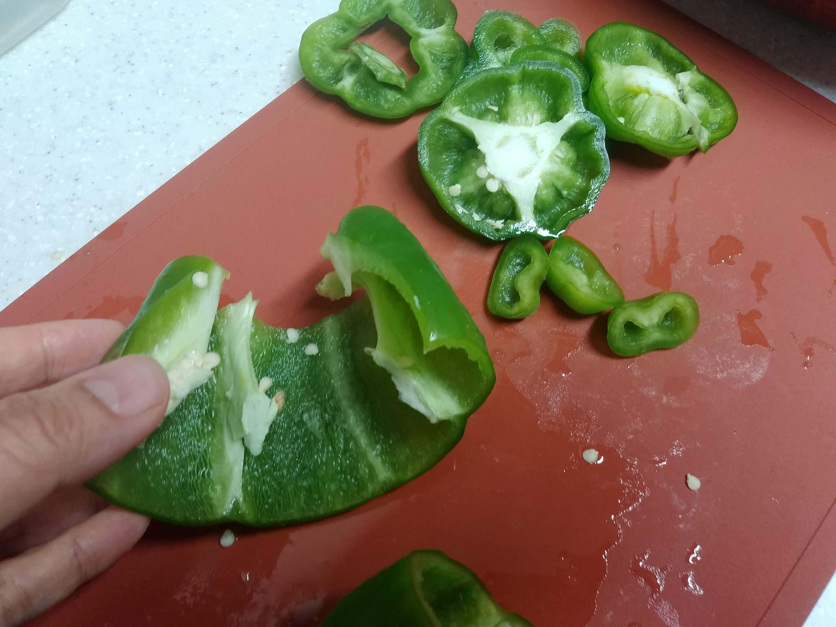 피망은 위아래를 잘라내고 펼친 후에 채 썰어줍니다. 양파도 새송이버섯도 채 썰어서 길이와 모양을 맞춥니다.