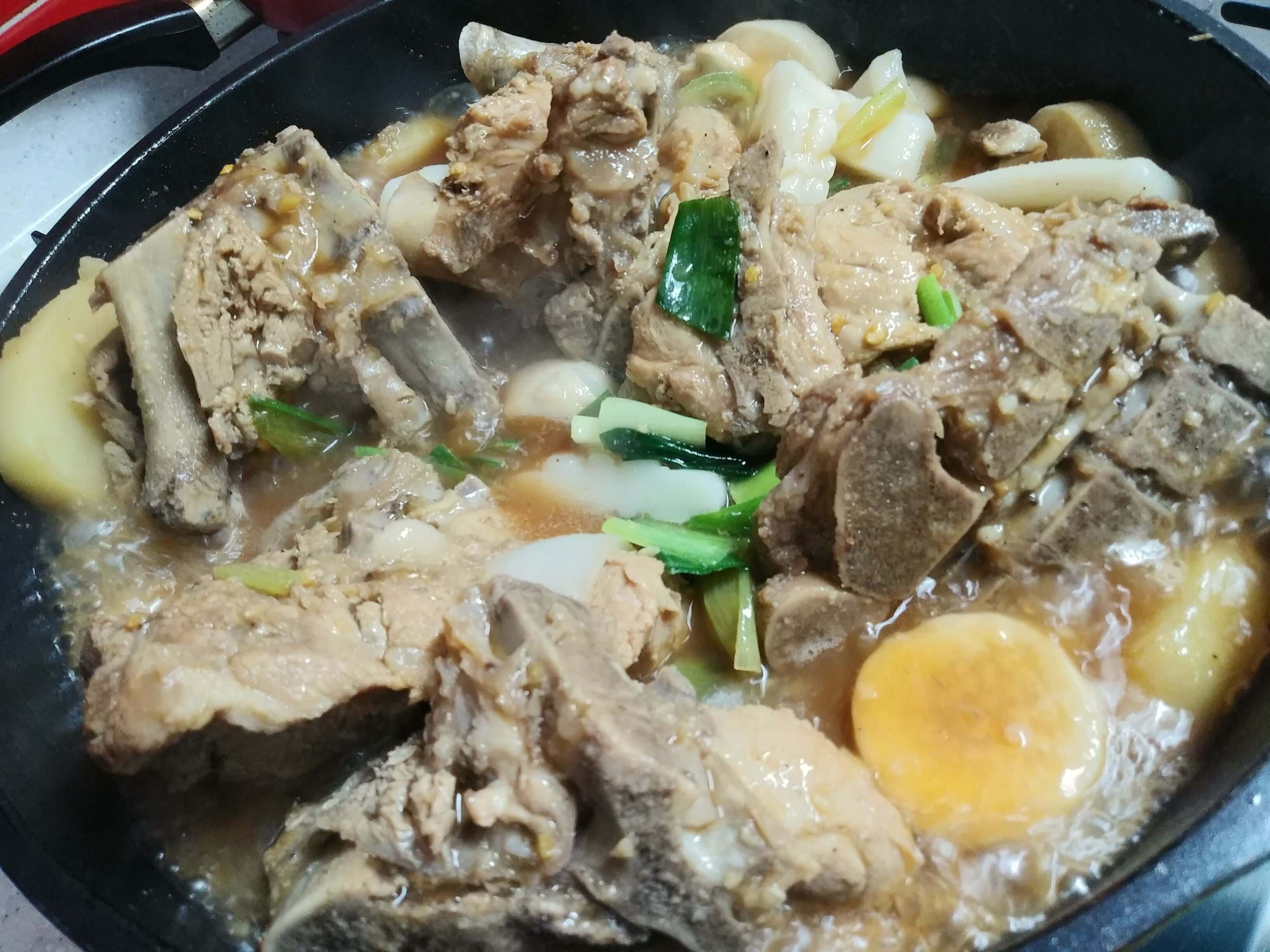 양념을 고기에 끼얹어주면서 채소를 익히고 남은 육수의 양을 보면서 좀더 졸여줍니다. 그리고나서 고기만 꺼내서 접시에 먼저 담습니다. 그리고 궁중팬에 남아있는 육수에 불린 당면을 넣고 떡도 넣고 끓입니다. 당면이 다 익으면 당면과 채소를 고기 위에 부어줍니다. 그러면 완성!