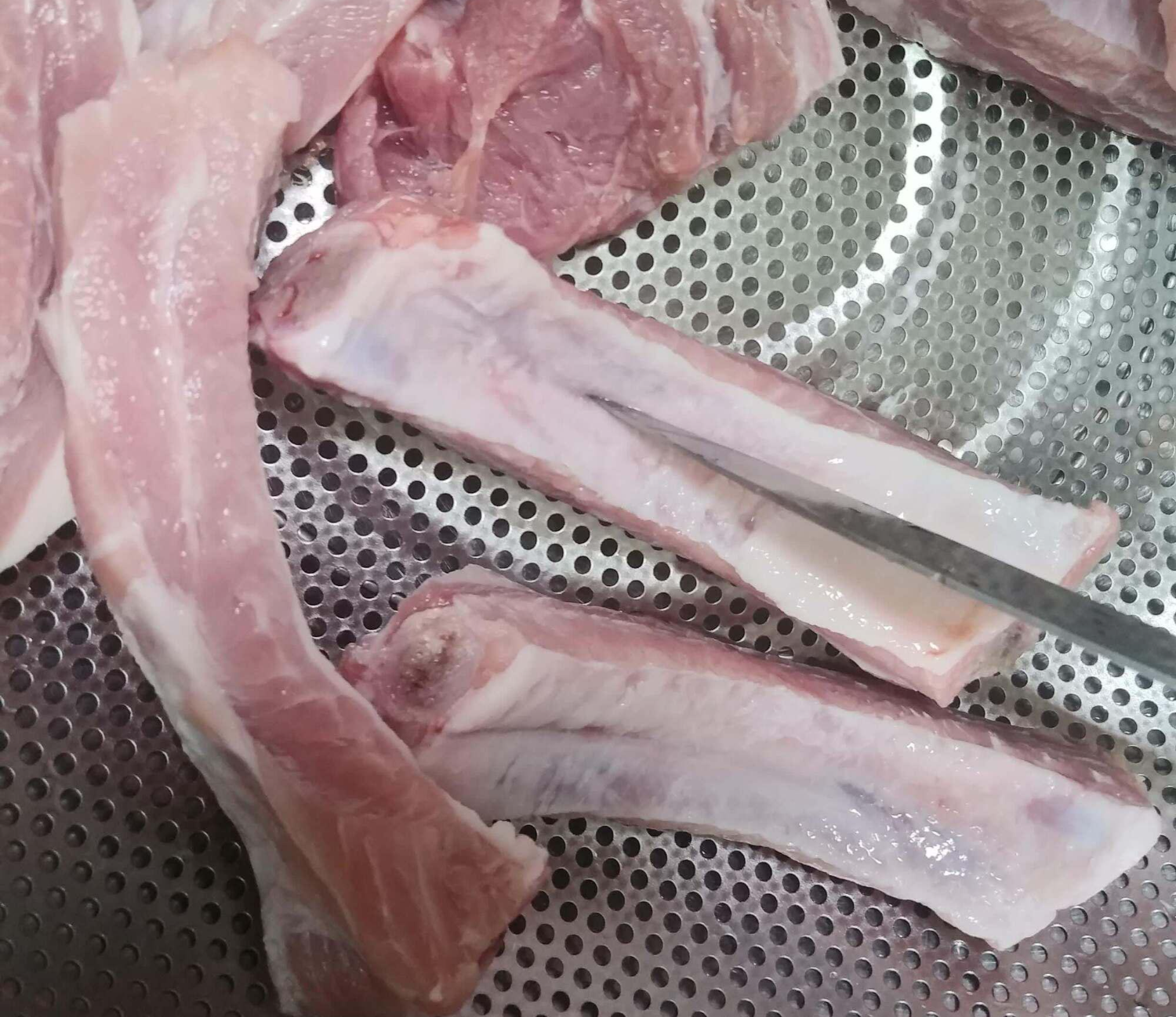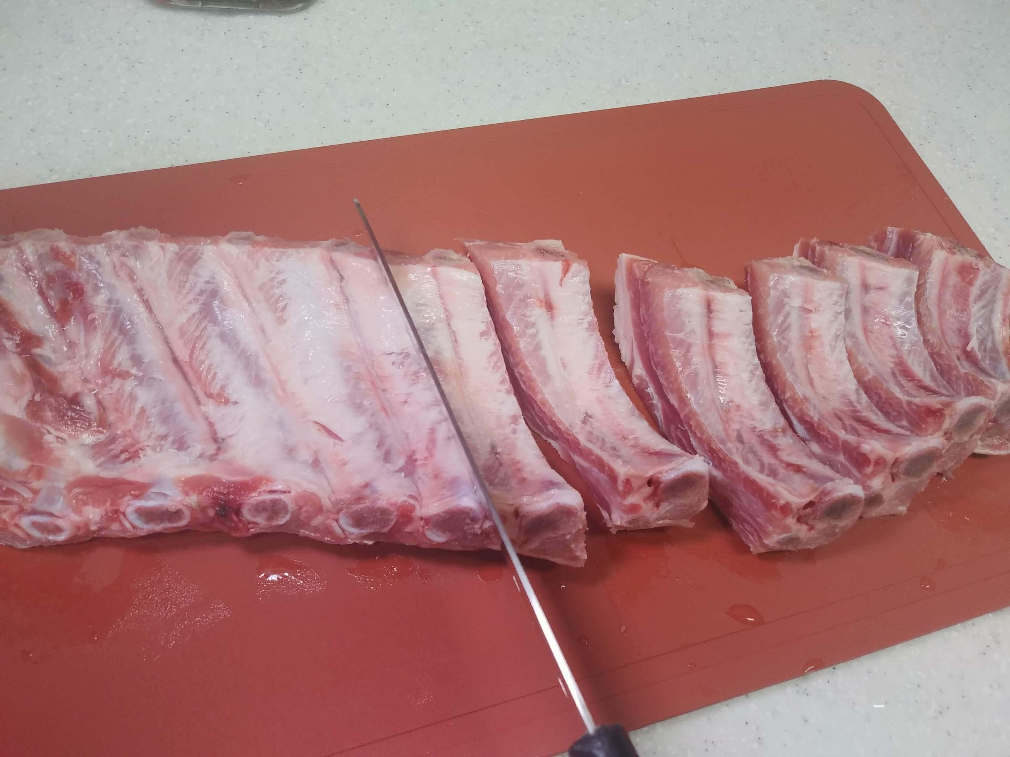 쪼개져있지 않은 등갈비를 샀어요. 부드러운 식감을 위해 갈비 안쪽의 얇은 근막을 떼어내고 썰어줍니다.