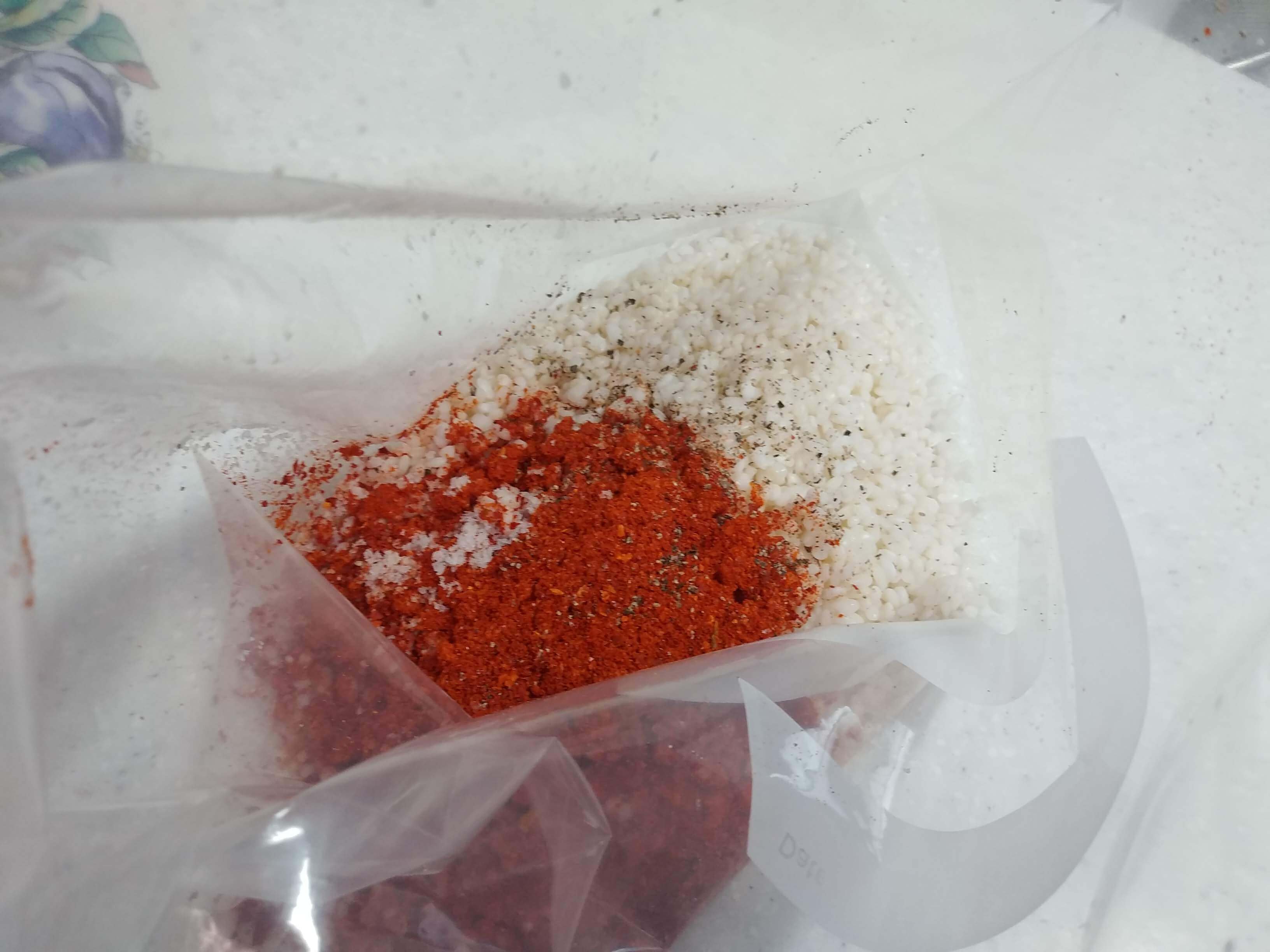 우선 닫힌 지퍼백을 흔들어서 고춧가루와 소금, 후춧가루가 골고루 섞이도록 합니다.