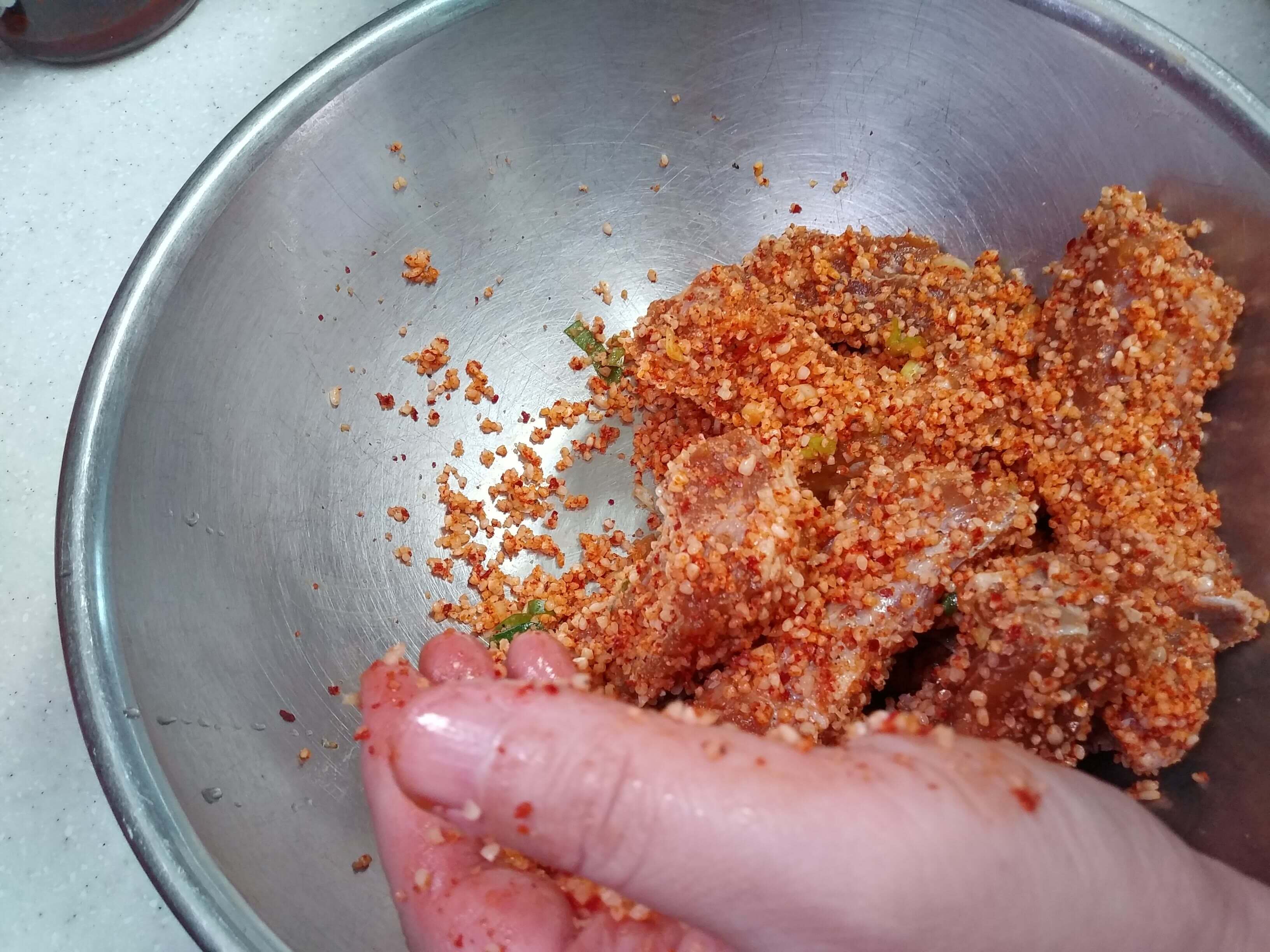 그리고 양념된 고기를 꺼내 볼에 담고 고춧가루 양념된 찹쌀을 넣어 묻혀줍니다.