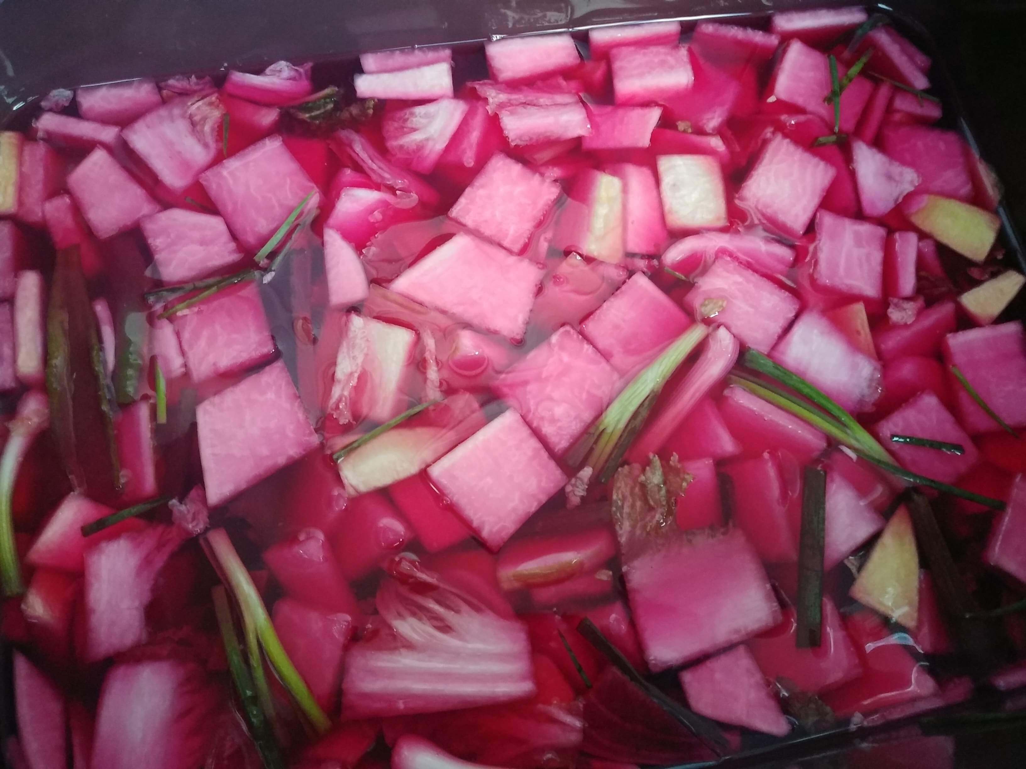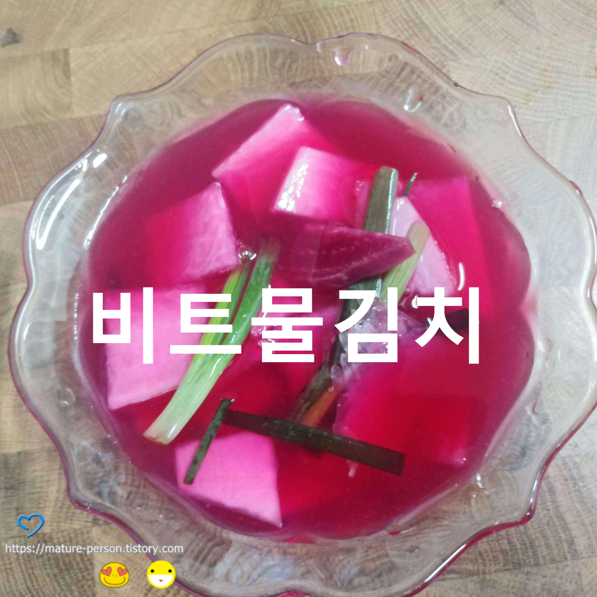 설탕을 넣지 않았는데 단맛이 나서 신기했고요 비트의 쓴맛이 날까 봐 걱정되었는데 전혀 그렇지 않았어요. 나중에는 그냥 분홍 물든 무 같았어요. 비트의 색이 빠지기 시작해 국물에 우러나서 국물색이 점점 빨갛게 물들어 배추와 무까지도금방 빨개집니다.
