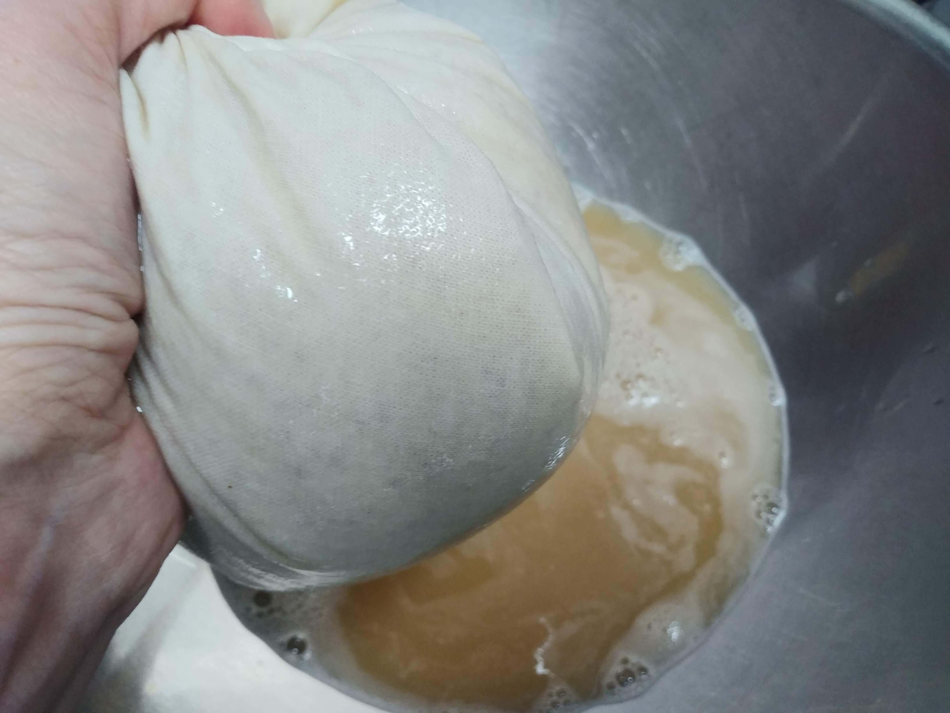 8. 5번 사진의 재료를 모두 믹서기로 갈아주니 이런 색이 나왔습니다. 갈아줄 때 뻑뻑하니까 만들어 놓은 물김치 국물을 1컵 넣어서 같이 갈아주면 잘 갈립니다. 갈아준후에 면포에 올려서 꼭 짜줍니다. 저는 물김치국물을 1컵 하고도 2컵 정도 더 넣고 갈았더니 면포로 걸러서 짜줄 때 좀 힘들었어요. 그만큼 물기가 많으니까 더 오래 걸리고 손목도 아팠네요. 되도록 물은 덜 넣고 갈아야 간편합니다.
