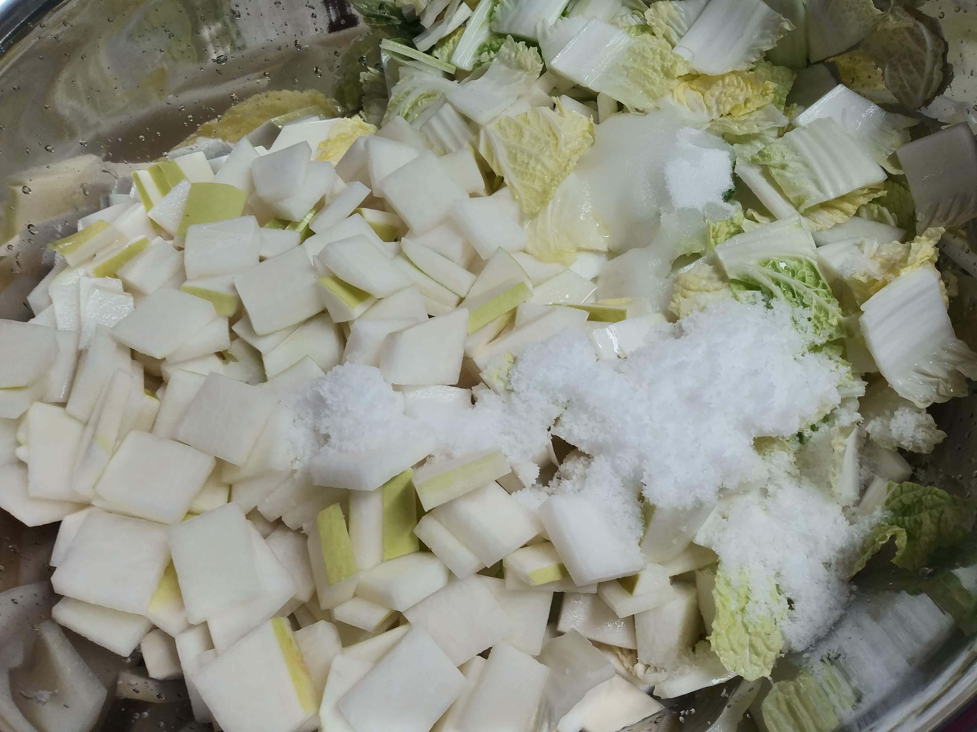 1. 우선 배추와 무를 절입니다. 배추를 썰어서 씻은 후에 절였어요. 그래서 절인 후에는 헹구지 않고 바로 물기만 빼주어 만듭니다.