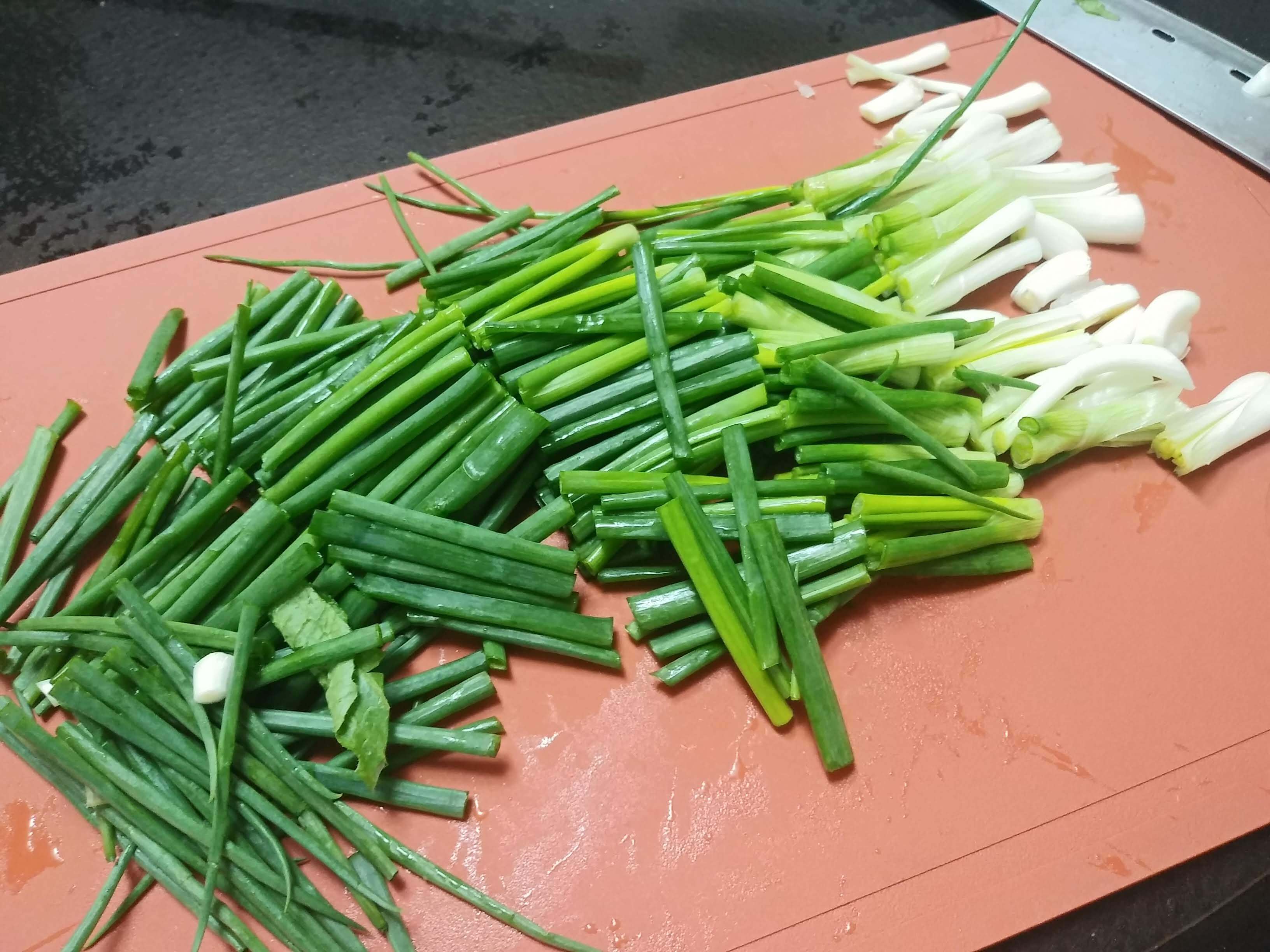 쪽파랑 갓도 4~5cm 길이로 썰었습니다. 쪽파의 흰 부분 중 굵은 것은 반으로 쪼갰어요.