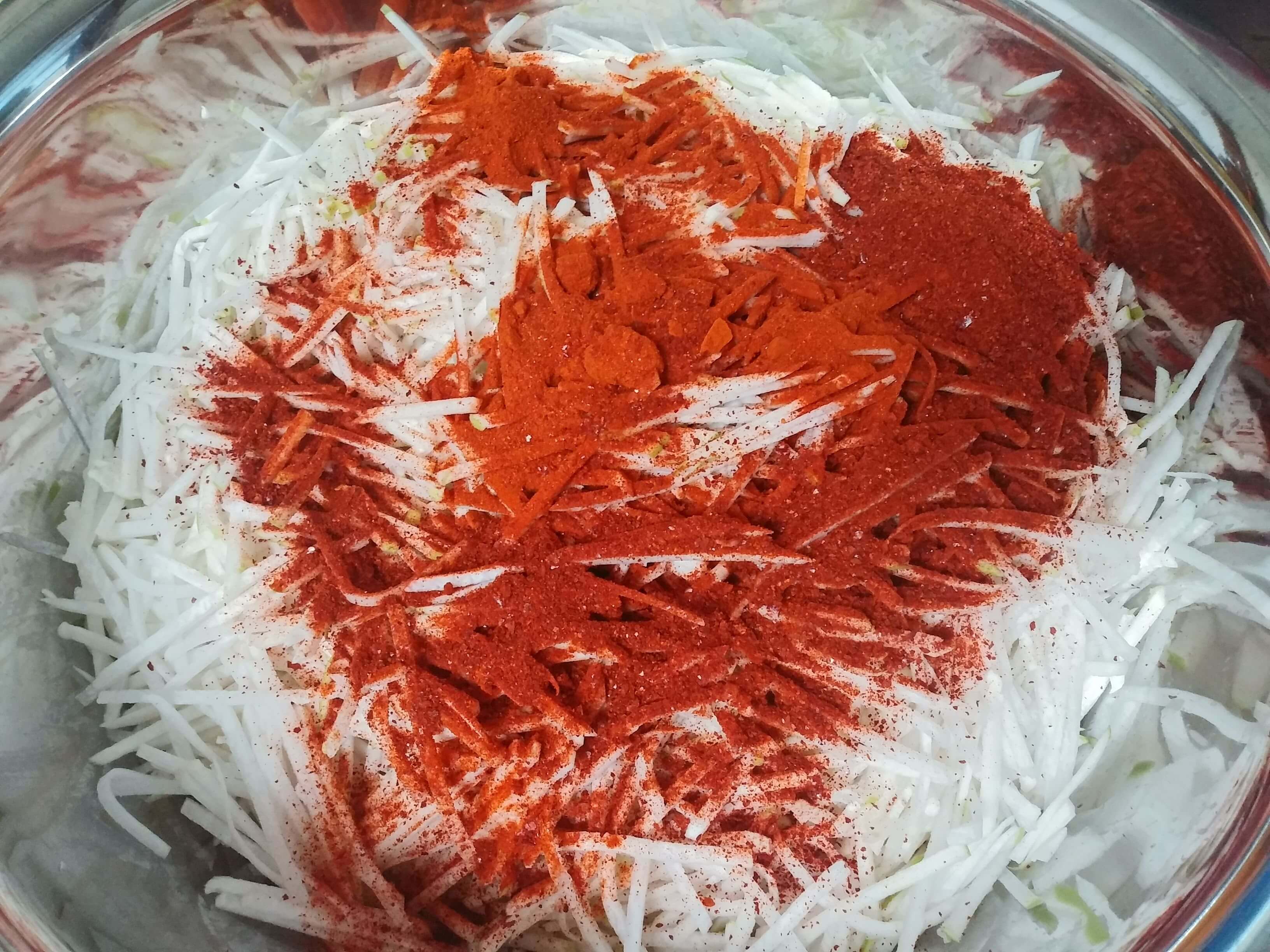 드디어 김장날 아침입니다. 절임배추가 오후 늦게야 도착한다고 해서 오전에 택배 대리점으로 찾으러 갈 생각으로 새벽 일찍 일어나 무를 썰었습니다. 무는 채칼로 남편이 모두 썰어주었어요. 혹시 마르려나 싶어 고운 고춧가루 1컵, 굵은 고추가루 1컵 넣고 버물버물 섞어서 다라로 덮어놓았습니다. 고운 고춧가루를 좀 더 갈아놓을걸 그랬네요 있는대로 넣고 섞어놓았어요. 무가 마르는것도 막아주고 무에 색깔도 예쁘게 입혀집니다.