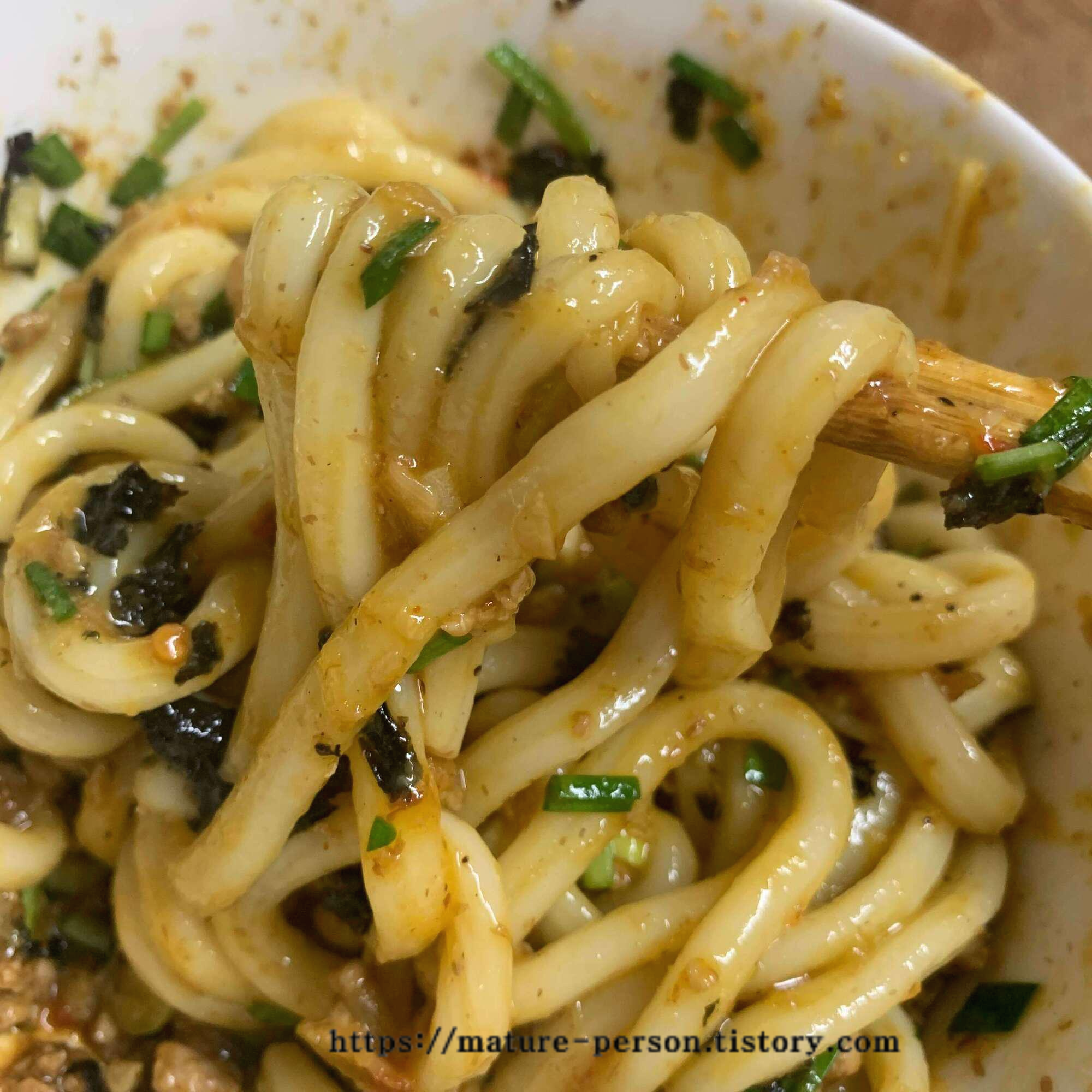 우동은 끓는 물에 넣고 제품 뒷면에 쓰여있는 대로 2분 삶은 후 건집니다. 헹구지는 않았습니다.