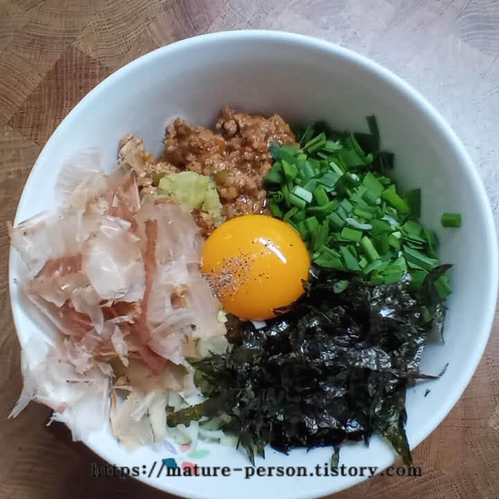 간단하지요? 대파랑 부추, 김, 가쓰오부시 준비하면 되고요. 간 고기는 양념에 볶아서 준비하면 됩니다. 불 요리는 고기만 볶으면 되지요. 그리고 가락국수(우동) 위에 모두 올려 비벼먹으면 완성!