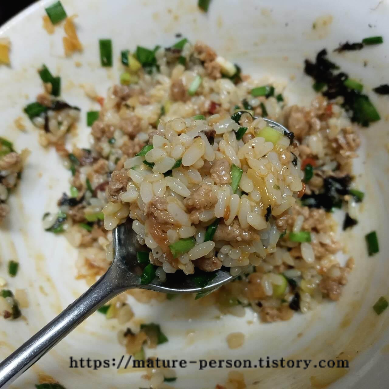 볶은 고기랑 부추, 대파를 올리고 다진 마늘을 1 찻숟가락 정도 넣었습니다. 구운 김도 올려요.