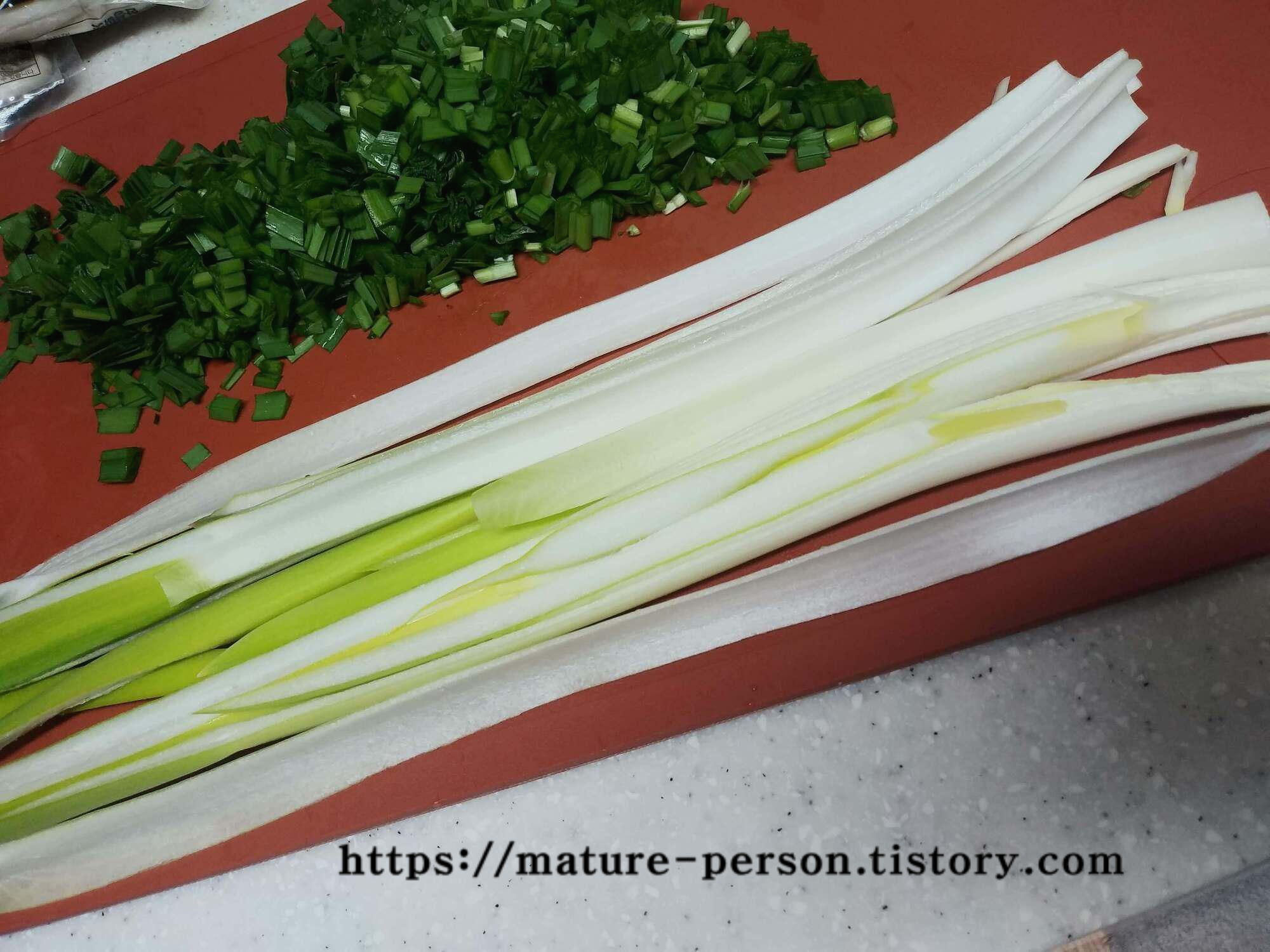 부추는 다듬어서 씻은후 다지듯 잘게 썰었습니다. 대파도 씻어서 길이로 십자모양으로 썰어 4등분내고 다졌습니다.