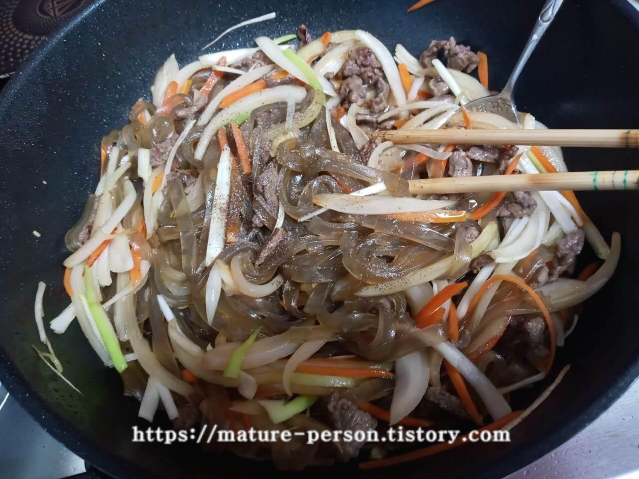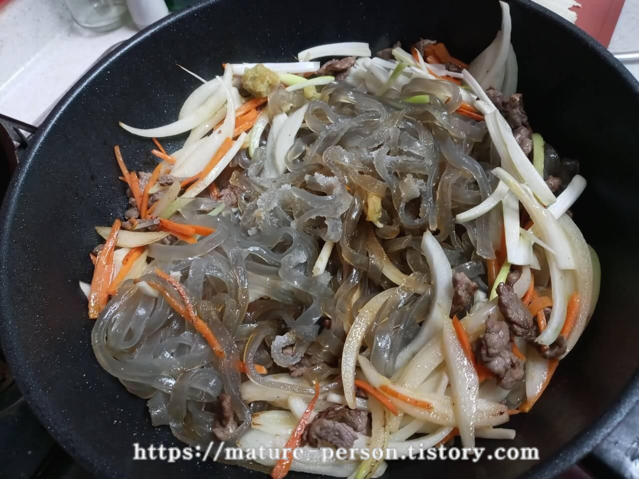 잡채는 원래 재료 하나씩 따로 손질하고 볶은후에 합쳐서 만드니까 번거로울 수도 있는데 이렇게 한 번에 볶아서 만드니 훨씬 수월합니다.
