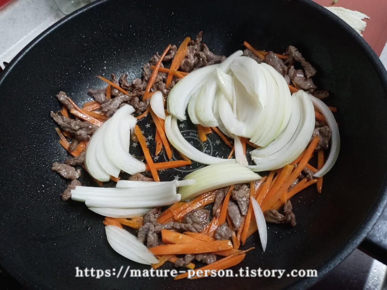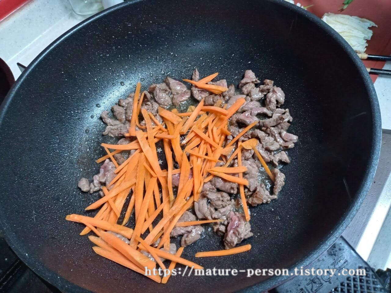 식용유를 3숟가락 넣고 소고기를 먼저 볶았습니다. 고기가 어느정도 익으면 당근을 넣고 볶다가 양파도 넣습니다.