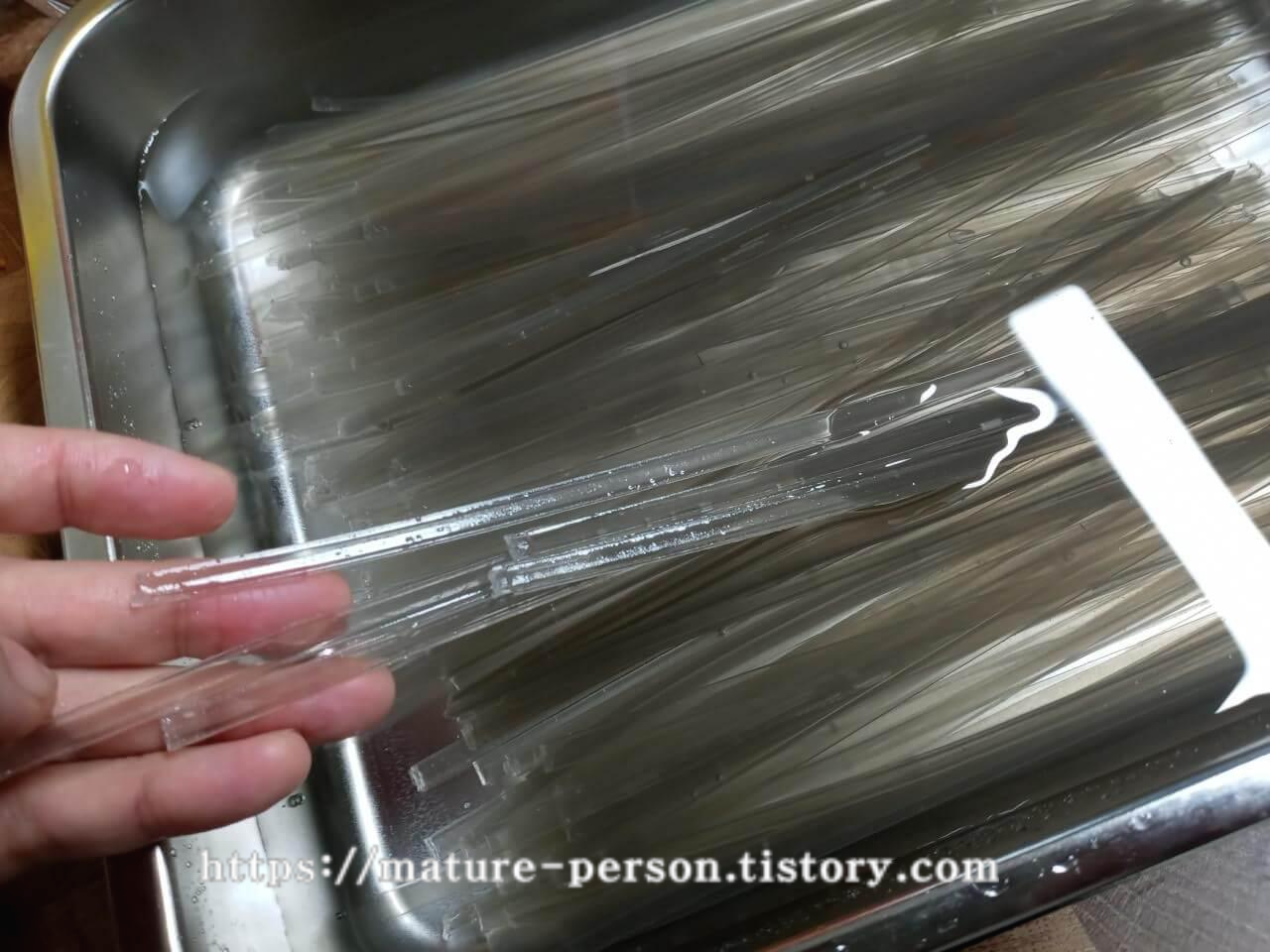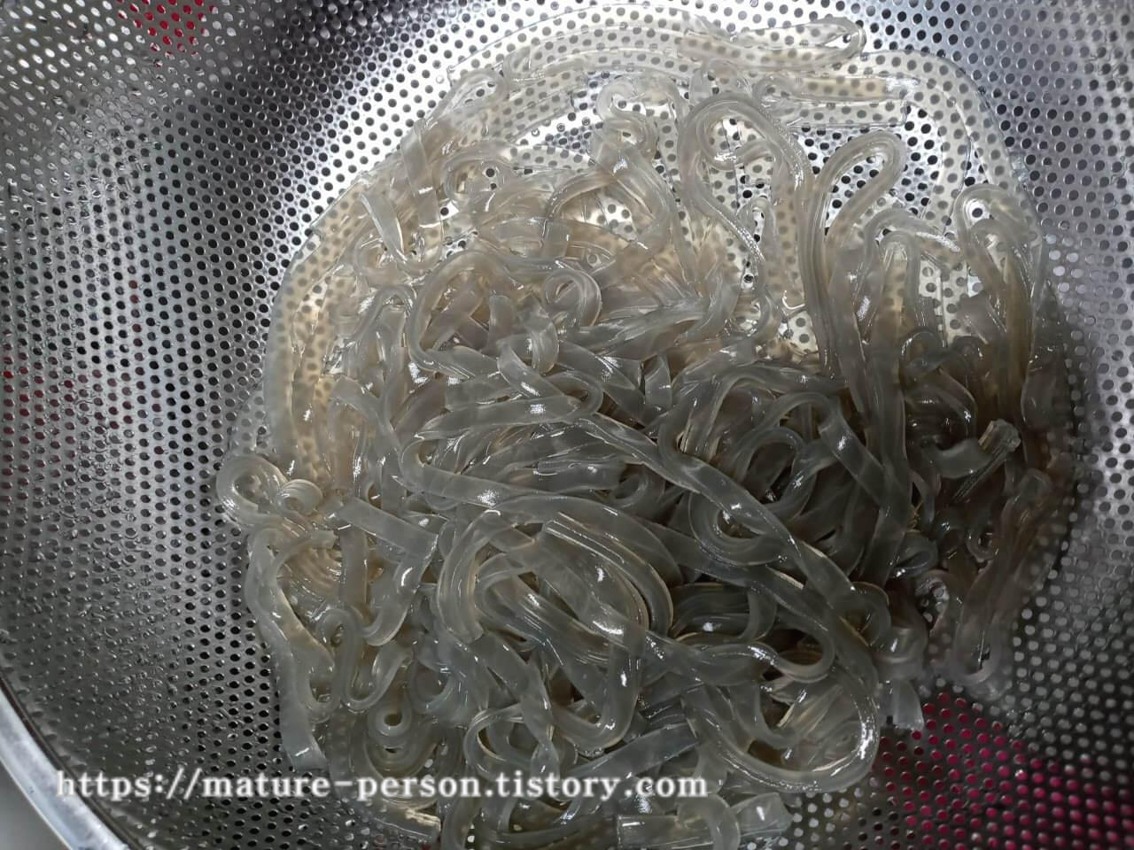 마른 당면을 찬물에 3시간 정도 담가놓았다가 삶았습니다. 삶을 때 진간장을 3숟가락 넣어 간을 했어요. 당면 봉지 겉면에는 삶는 시간이 10분이라고 나오지만 3시간 불려놓은 상태라 2분 정도 삶으니 모두 익었더라고요. 면이 익었는지 한 가닥 꺼내서 만져보고 먹어보면 확인이 가능합니다. 가운데 심이 씹히지 않으면 됩니다. 꺼내서 찬물로 헹궈 체반에 건져놨습니다.