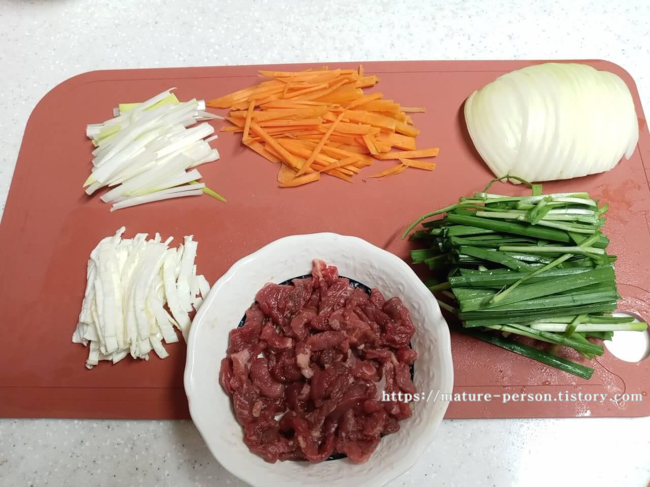 납작당면 250g(삶을 때 진간장 3숟가락), 소고기 100g(진간장 1/2숟가락, 맛술 1/2숟가락, 후춧가루), 당근 50g, 부추 70g, 양파 160g, 대파 1/2대, 달걀흰자 2개, 진간장 3숟가락, 설탕 2숟가락, 다진 마늘 1/2숟가락, 참기름 1숟가락, 후춧가루, 식용유