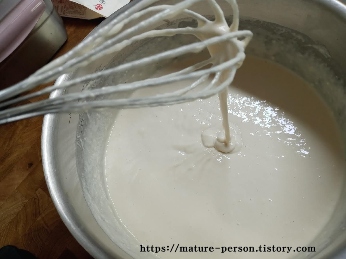 막걸리 1통에 미지근한 물을 섞어 놓습니다. 그리고 밀가루 1kg에 소금 1숟가락과 설탕 1컵을 넣은 후에 물이랑 막걸리 섞은 것을 부어줍니다. 처음에는 물을 2컵 넣고 섞었는데 반죽이 주르륵 흐르지 않더라고요. 그래서 1컵 더 넣었는데 약간 질어진 듯도해요. 미지근한 물을 2컵 반 정도만 섞어도 좋았을 것 같아요.
