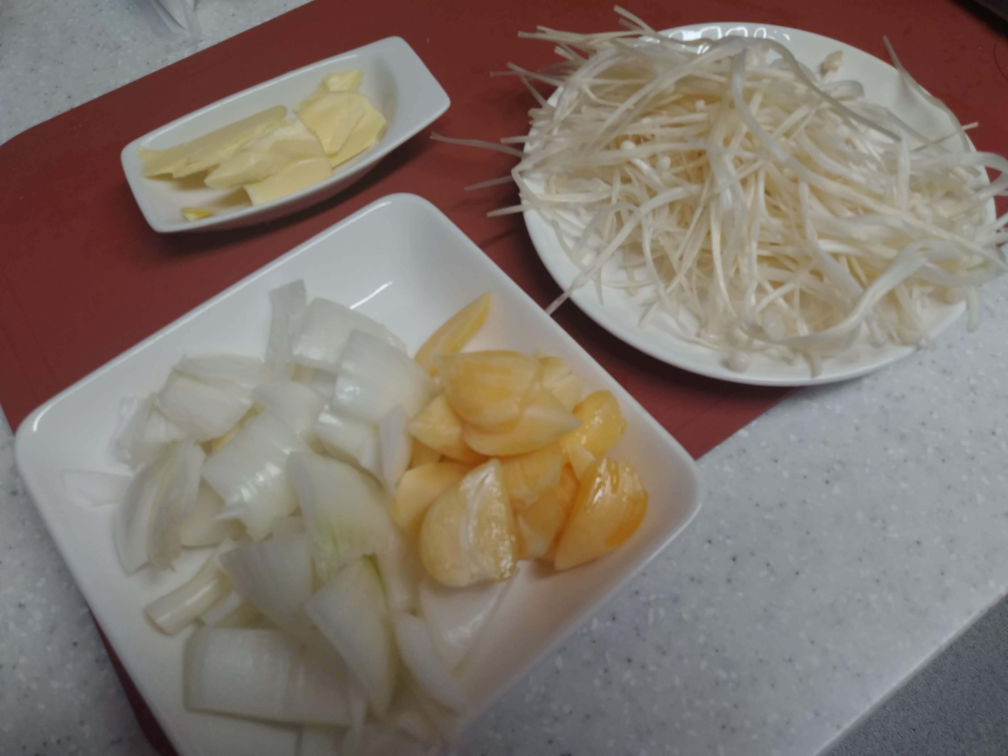 양파는 동그란 단면이 나오게 자르려다가 그러면 아이들이 잘 안 먹을 거 같아 작게 썰어봤습니다. 마늘은 저며놓았어요. 냉동실에 있던 버터도 잘라놓고 팽이버섯은 밑동을 잘라 헹궈서 준비합니다.
