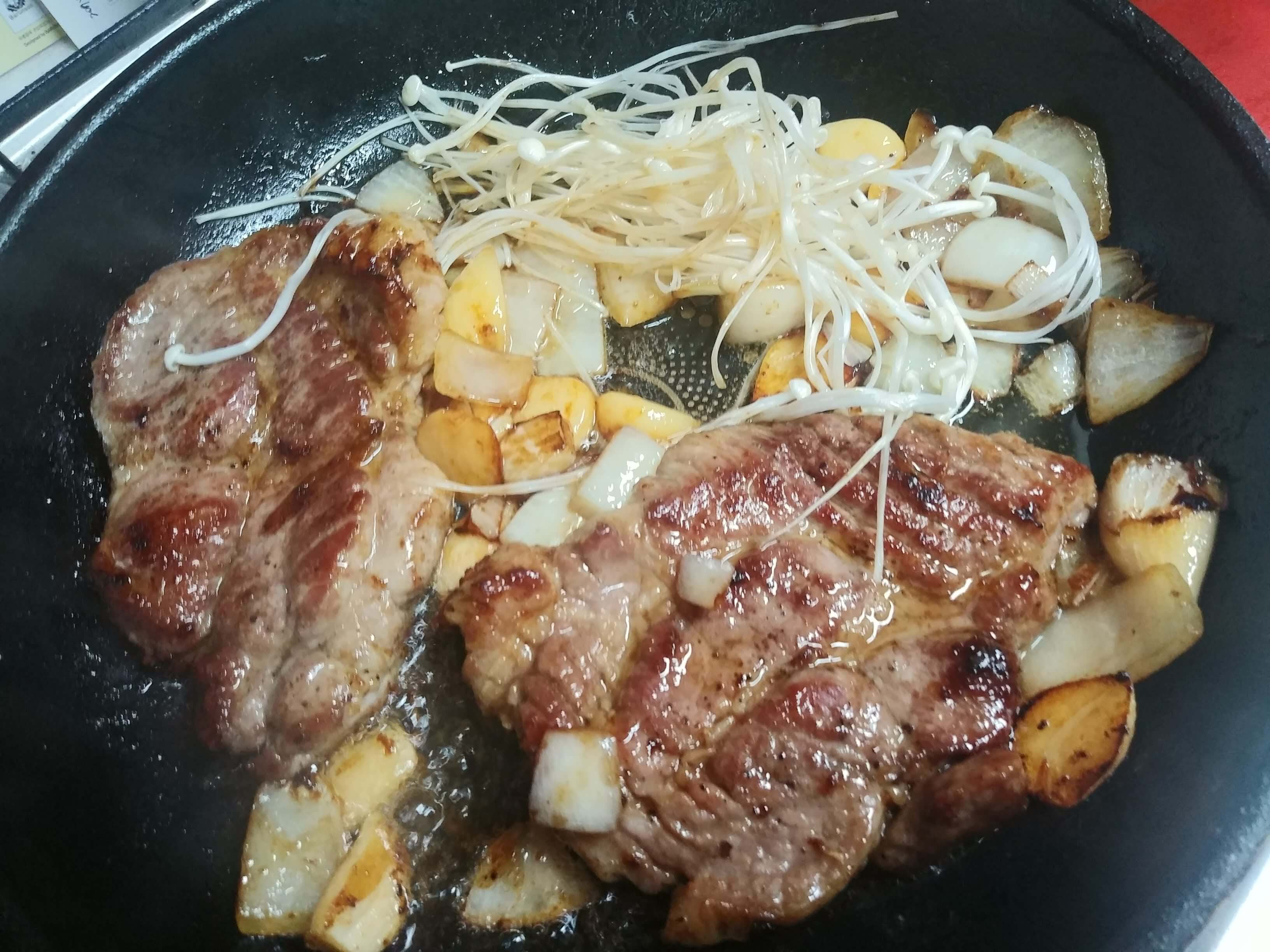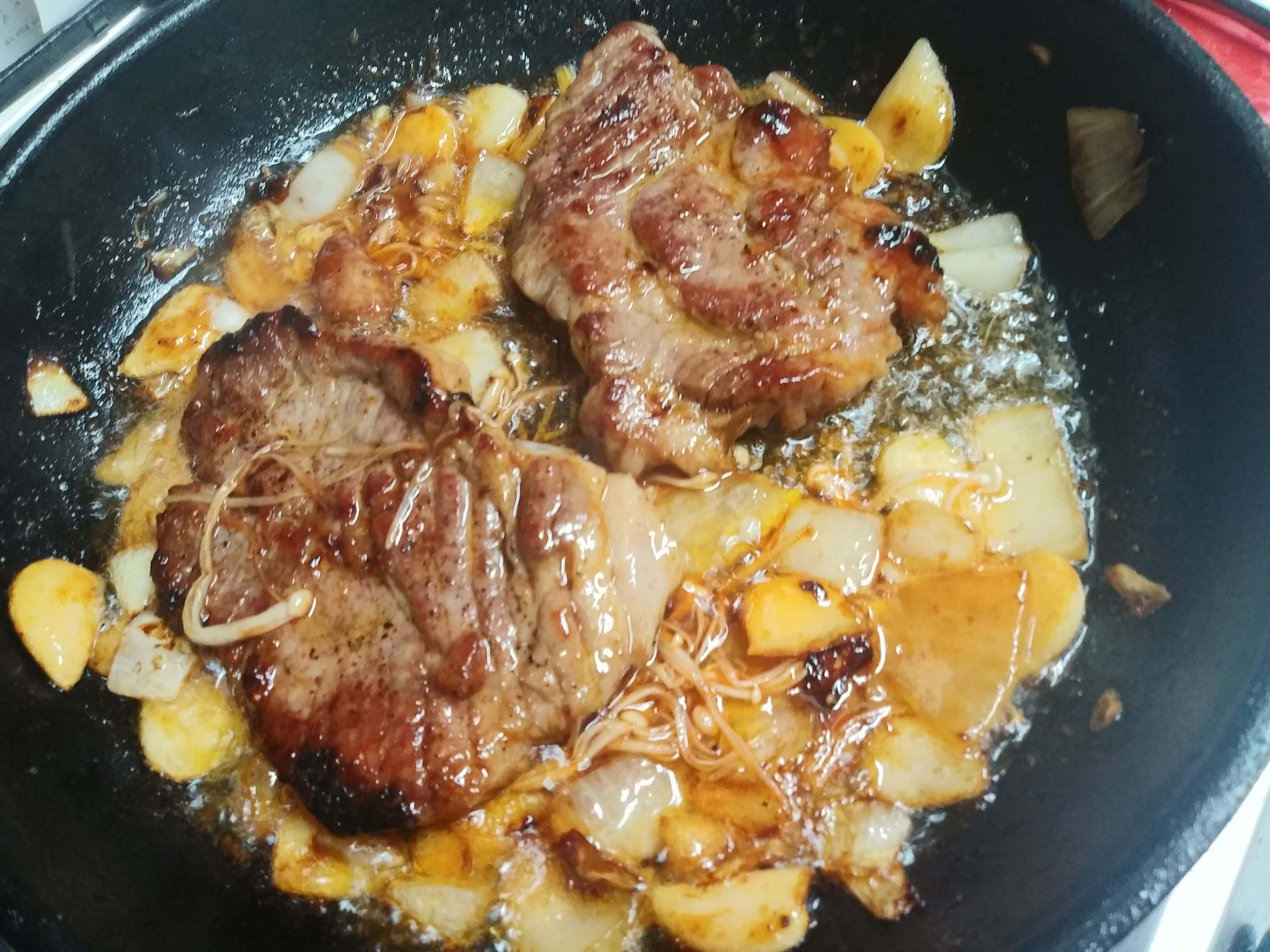 고기에 소스를 끼얹어주면서 졸이고 팽이버섯도 넣었어요. 소스의 간을 보면서 물을 약간 넣어 촉촉하게 끓여도 좋아요. 고기에 기본 간을 해줬기 때문에 사실 그냥 먹어도 맛있을것 같아요. 목살을 그냥 구워서 쌈장 찍어도 맛있으니깐요. 버터랑 우스타소스로 간을 더했으니 더 좋죠. 마늘, 양파도 맛있구요.