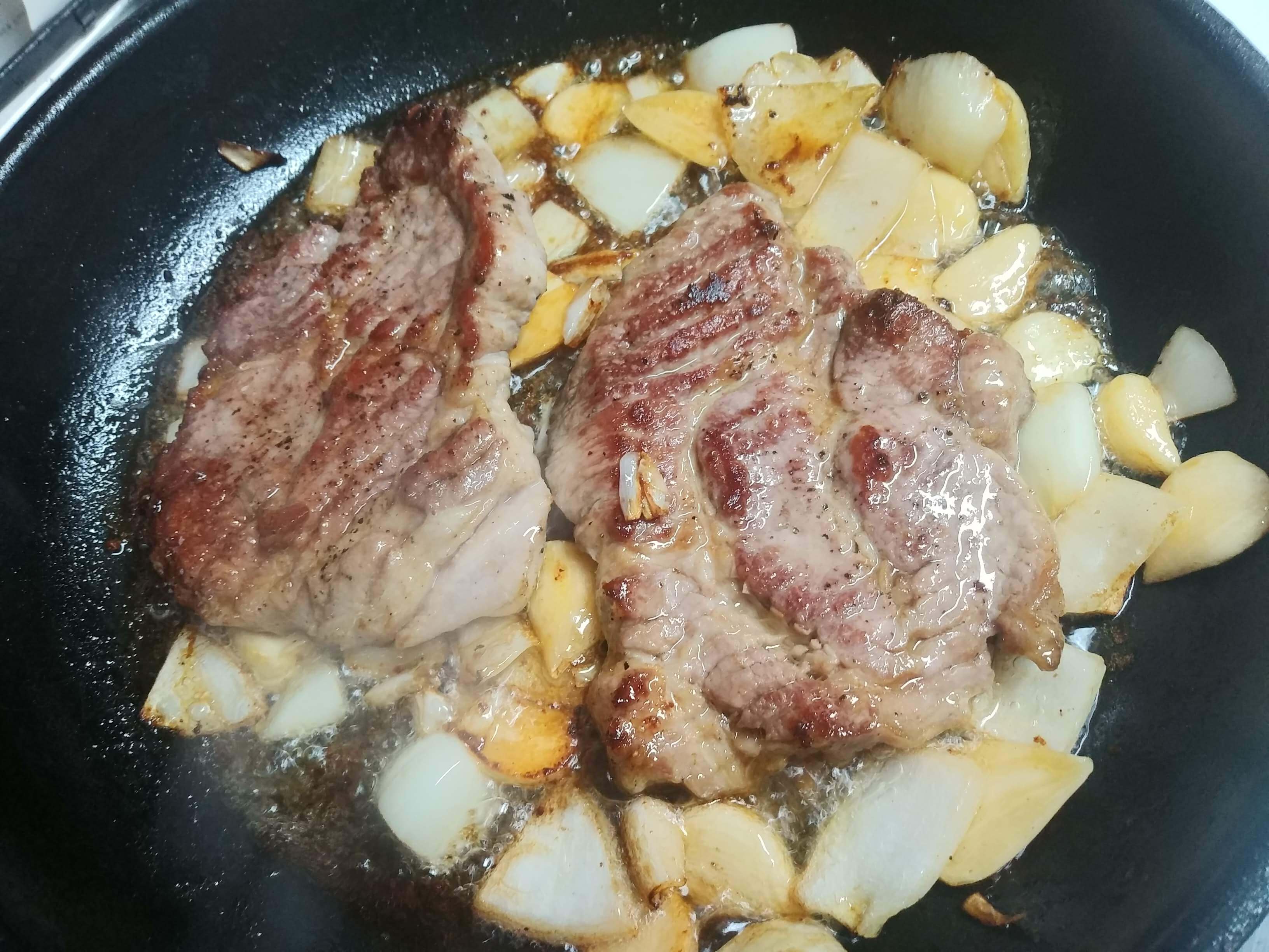 센 불로 고기 앞뒤를 노릇하게 구워줍니다. 기름이 많이 튀더라고요 뚜껑을 덮고 5분 정도 익혔어요. 중간에 마늘과 양파도 넣고 익혀요.