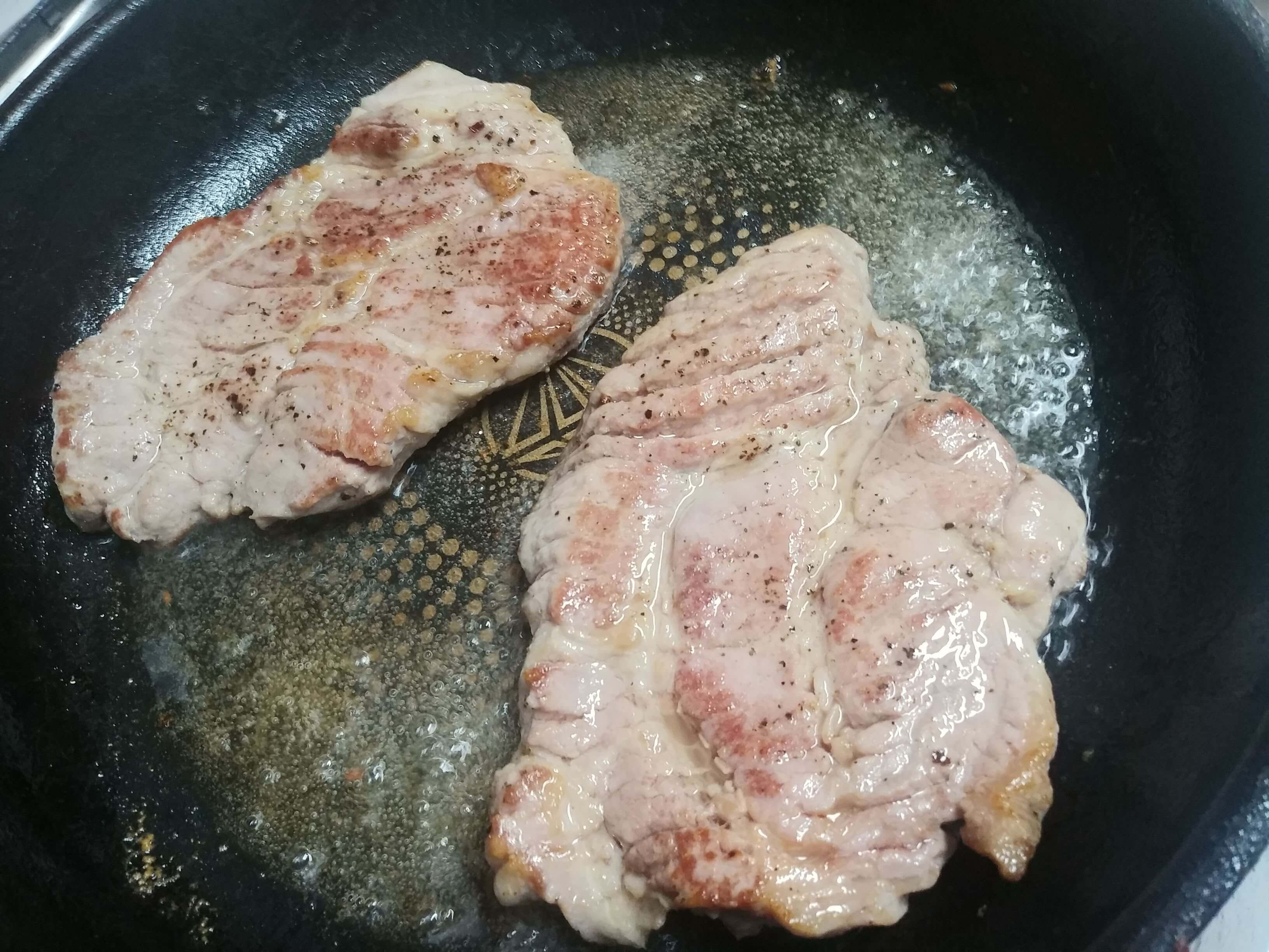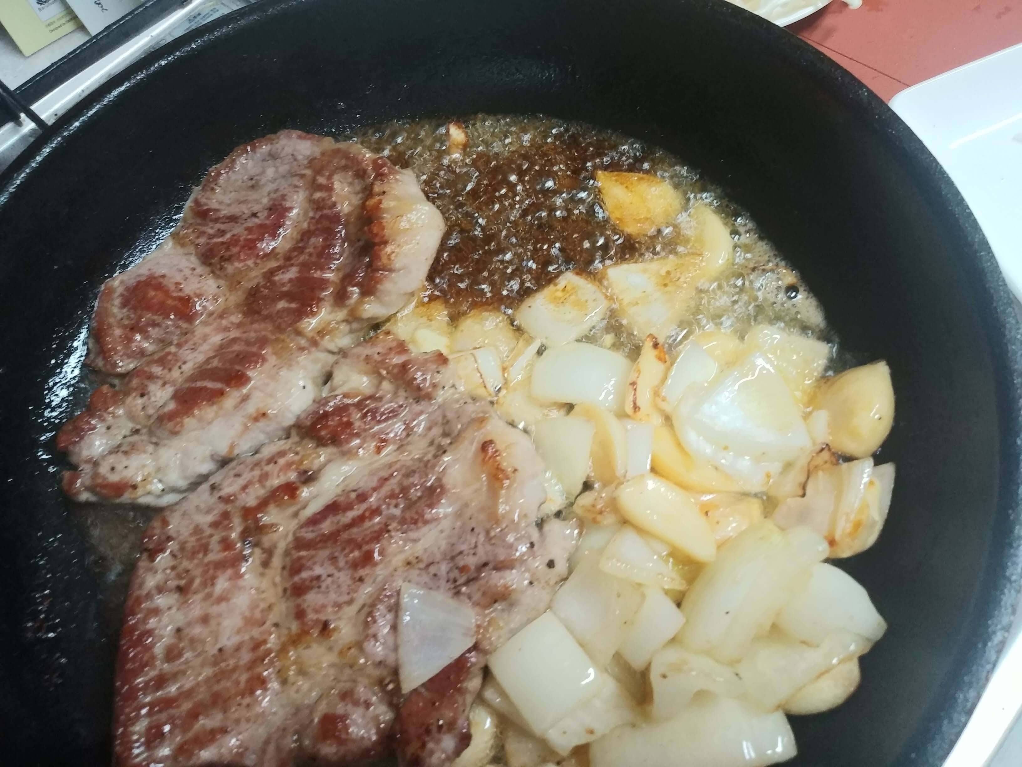 돼지고기 목살 380g, 식용유, 맛소금, 후춧가루, 버터 15g, 양파 1/2개, 깐 마늘 8개, 팽이버섯, 설탕 1숟가락, 우스타 소스 1숟가락, 케첩 1숟가락, 달걀 반숙 프라이