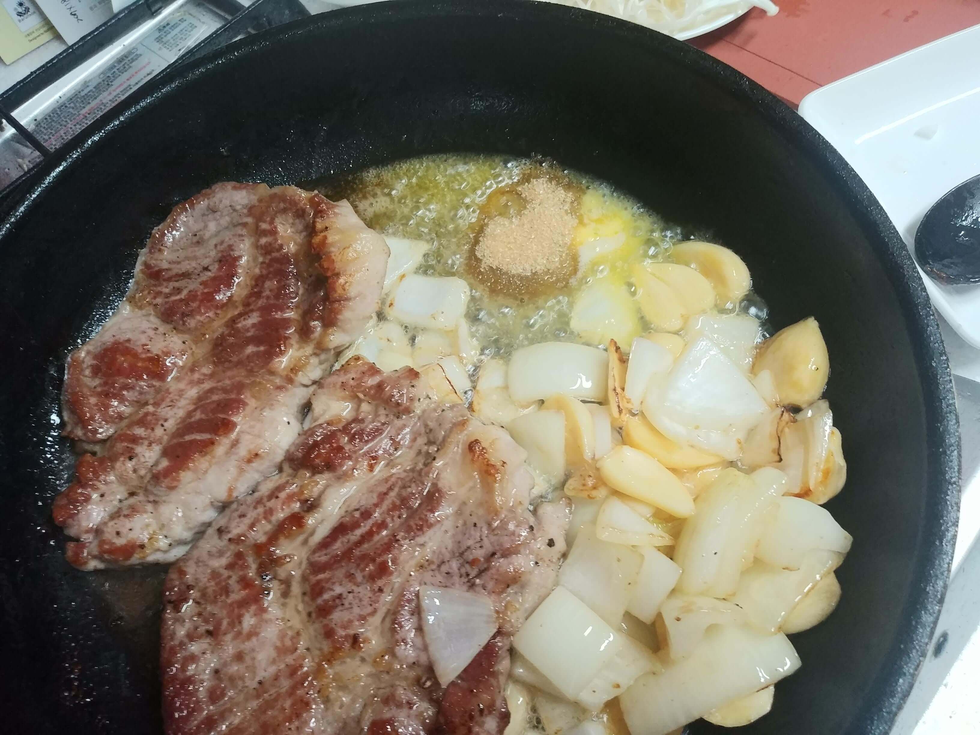 다 익은 고기와 마늘, 양파를 접시에 담고 남은 소스도 뿌립니다.