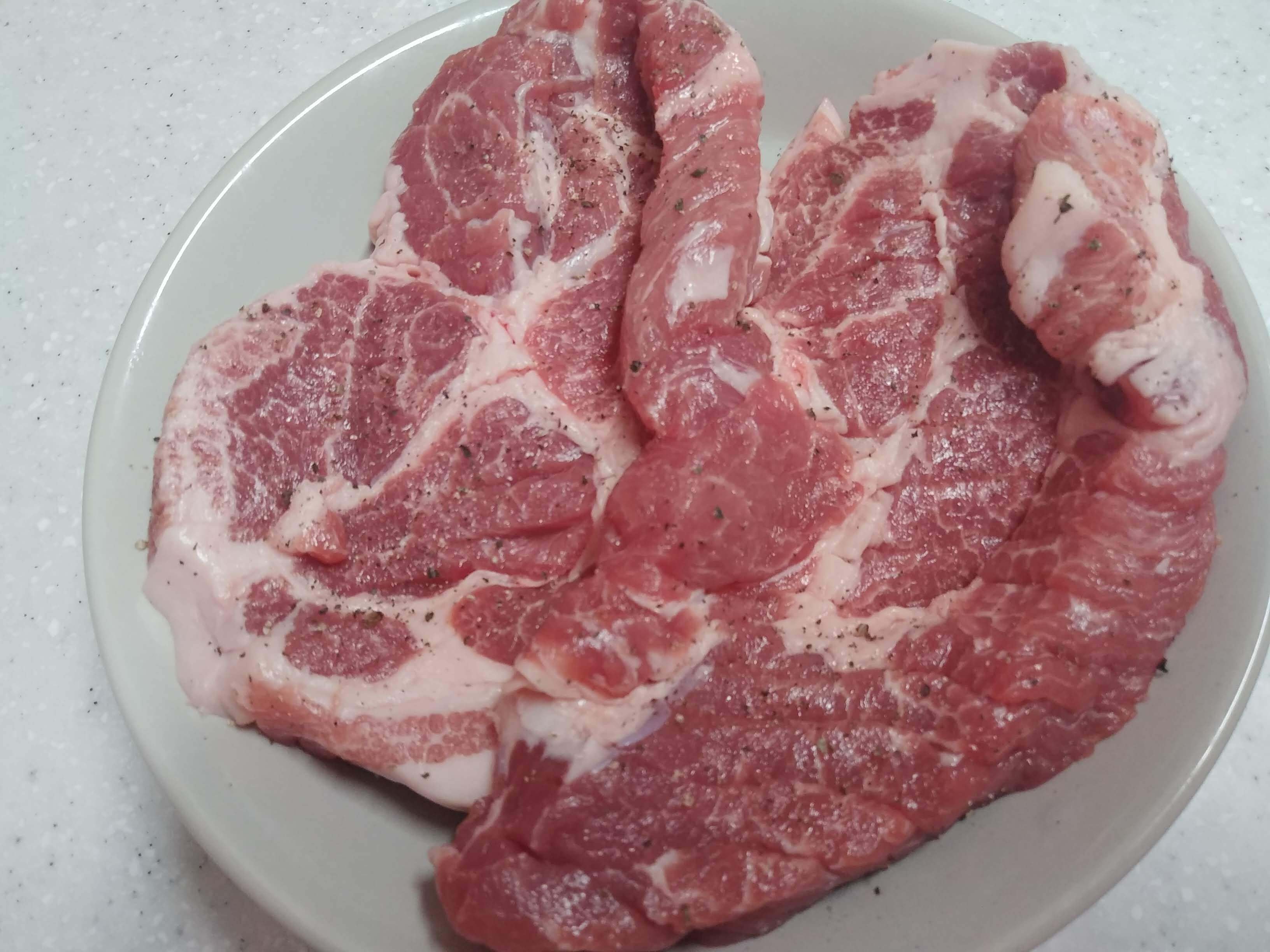 목살이 1cm 두께가 됩니다. 칼집을 사선으로 넣어줍니다. 맛소금 1찻숟가락정도 고기 앞뒤로 뿌려주고 후춧가루도 뿌려 재워둡니다.