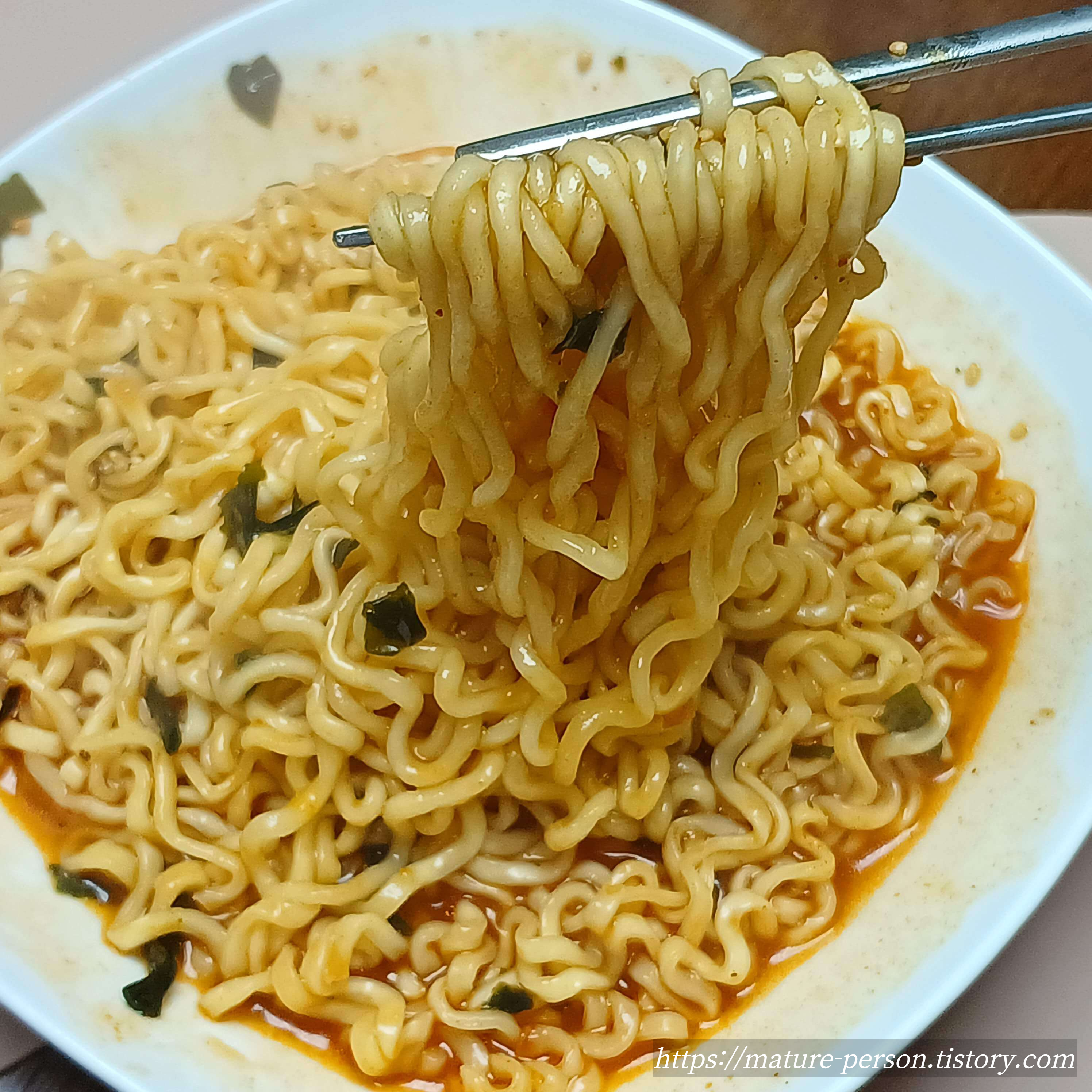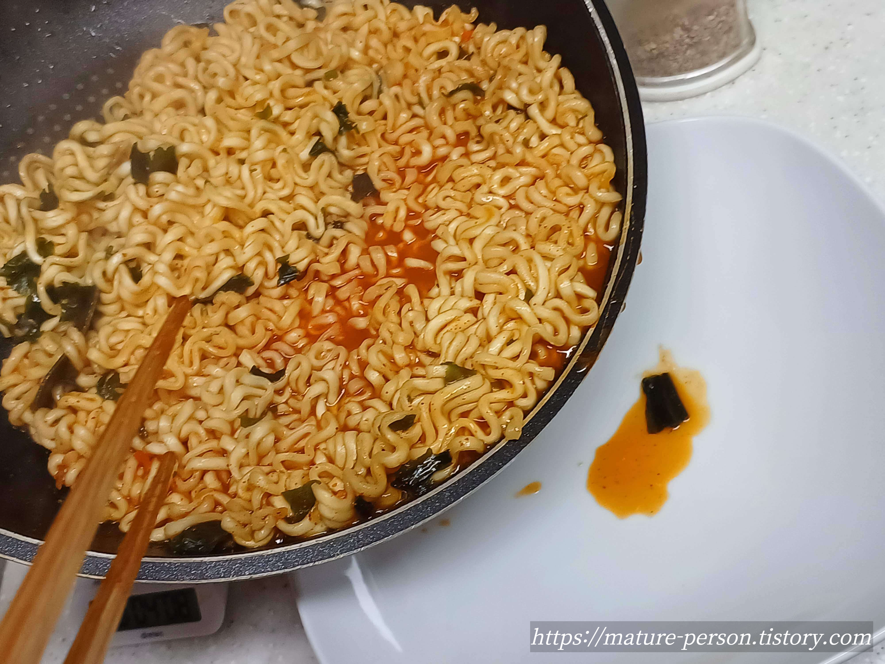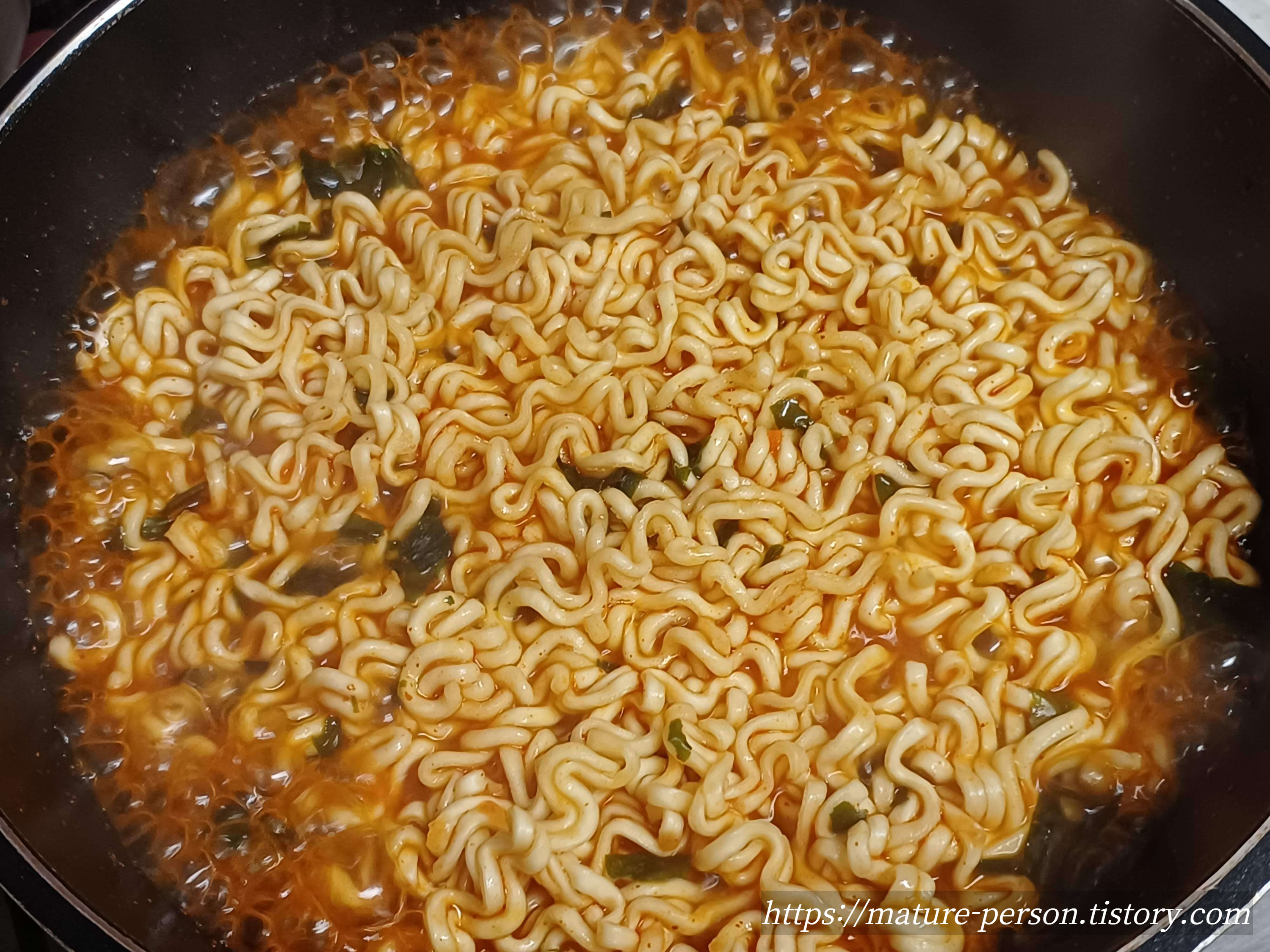면을 익을때까지 끓입니다. 면이 푹 익는건 싫어서 꼬들할때 불을 끄고 담습니다. 볶음면은 아니예요. 국물이 자작하게 있도록 합니다.