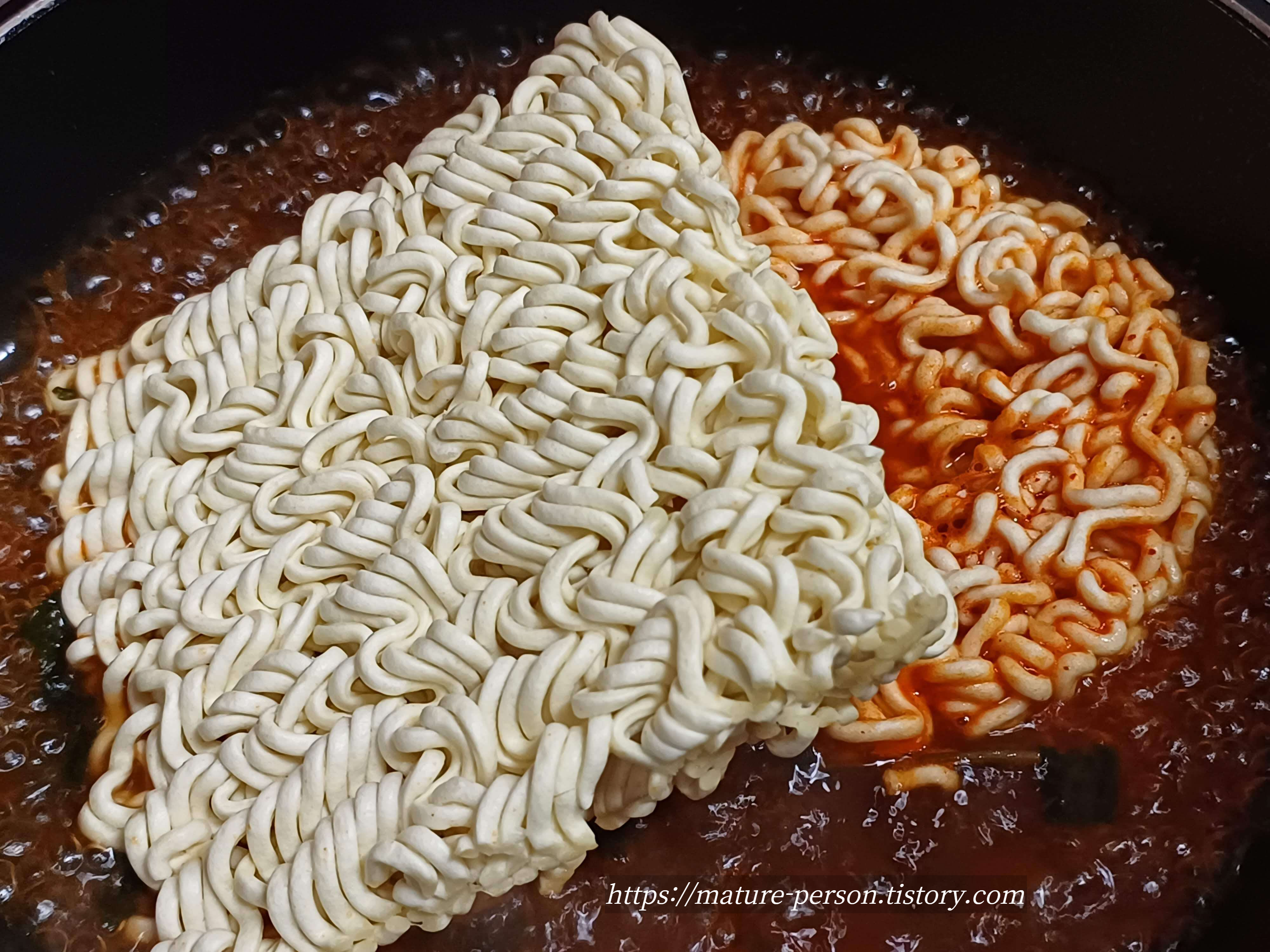 끓어오르면 너구리면과 불닭볶음면 사리를 모두 넣습니다.